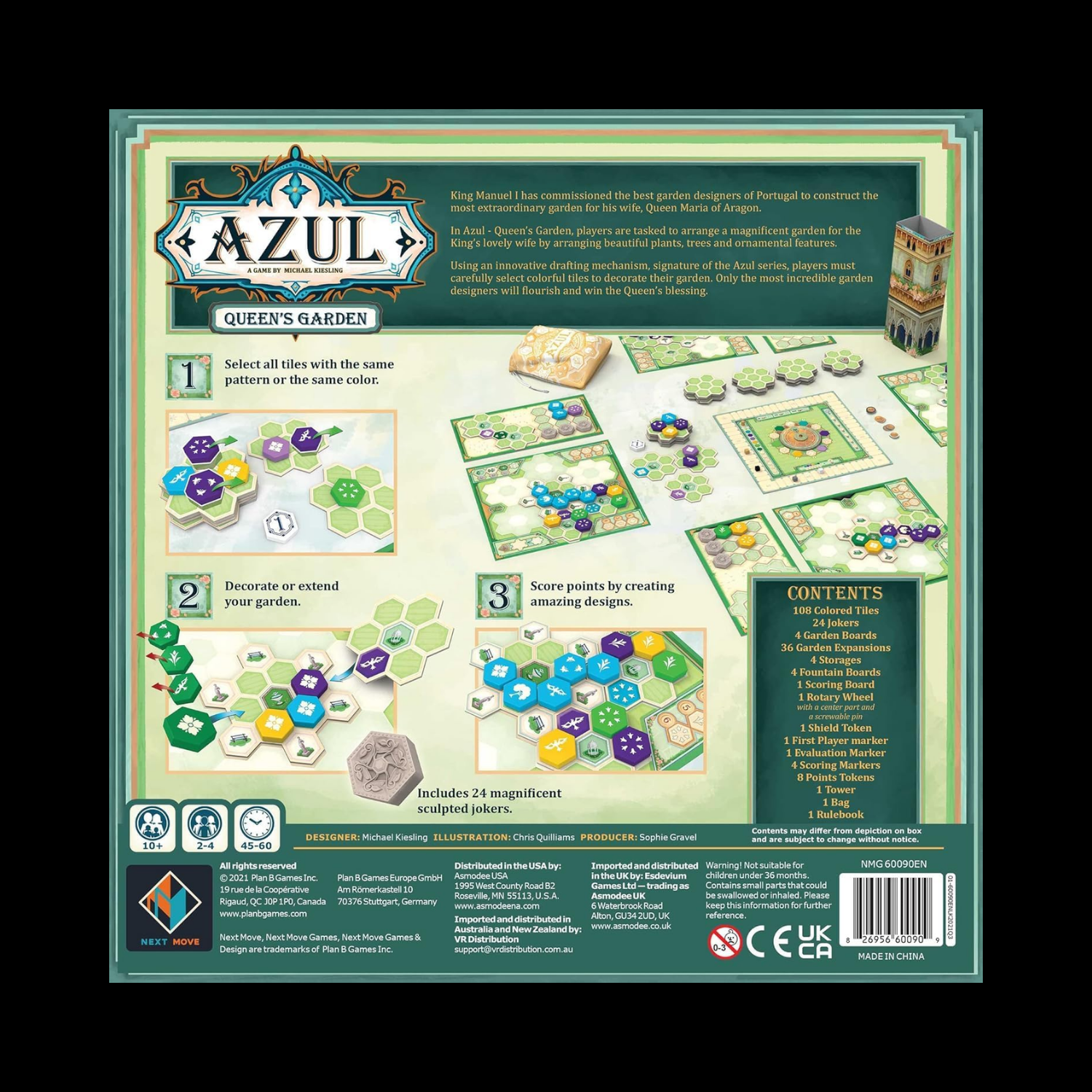 Le roi Manuel 1er a commandé aux meilleurs concepteurs de jardins du Portugal pour créer le jardin le plus extraordinaire pour sa femme, la reine Maria. Dans Azul - The Queen’s Garden, les joueurs doivent créer le plus beau jardin pour la femme du roi, avec des plantes, des arbres et des détails architecturaux. En utilisant le mécanisme de « draft » signature d’Azul, les joueurs doivent sélectionner les tuiles les plus colorées pour décorer leurs jardins. Seuls les plus beaux jardins fleuriront leur chemin vers la victoire !
