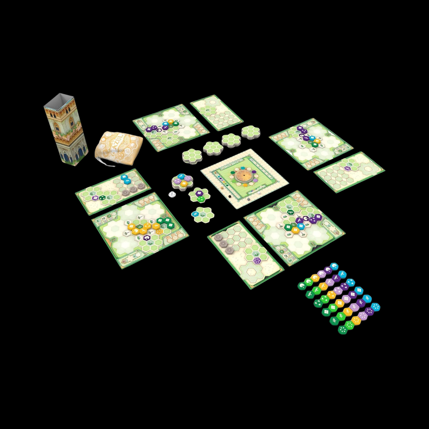 The Queen’s Garden est le plus grand jeu de la famille Azul, avec plus de composants, un plateau de joueur plus grand et de nouvelles tuiles hexagonales.