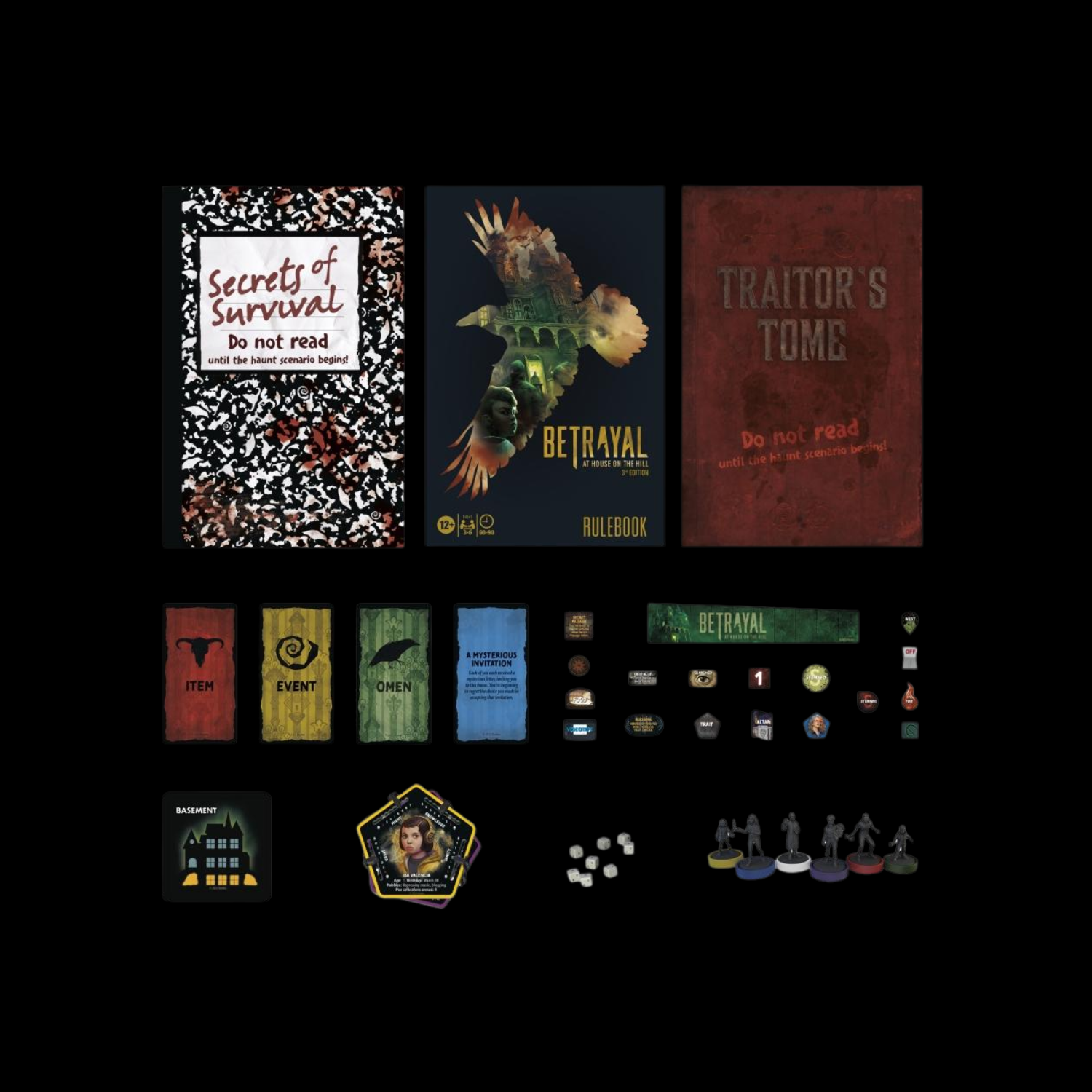 Comprend des livres de Tome and Secrets of Survival haunt de Traitor, 6 planches de personnages à double face, 6 figures de personnages finement détaillées, bases de figures à 6 personnages, 30 clips, 8 dés, 74 cartes de jeu, 5 cartes de scénario, carte de référence du monstre, carte de référence du traître, 6 cartes de référence du joueur, 3 tuiles de départ, 42 tuiles pour une seule chambre, piste et pointeur de numéro, 114 jetons en carton et livre de règles.