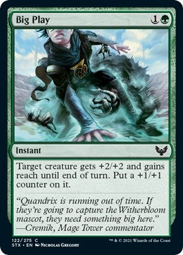 | Rules Text Contains: | Target creature gets +2/+2 and gains reach until end of turn. Put a +1/+1 counter on it. |
