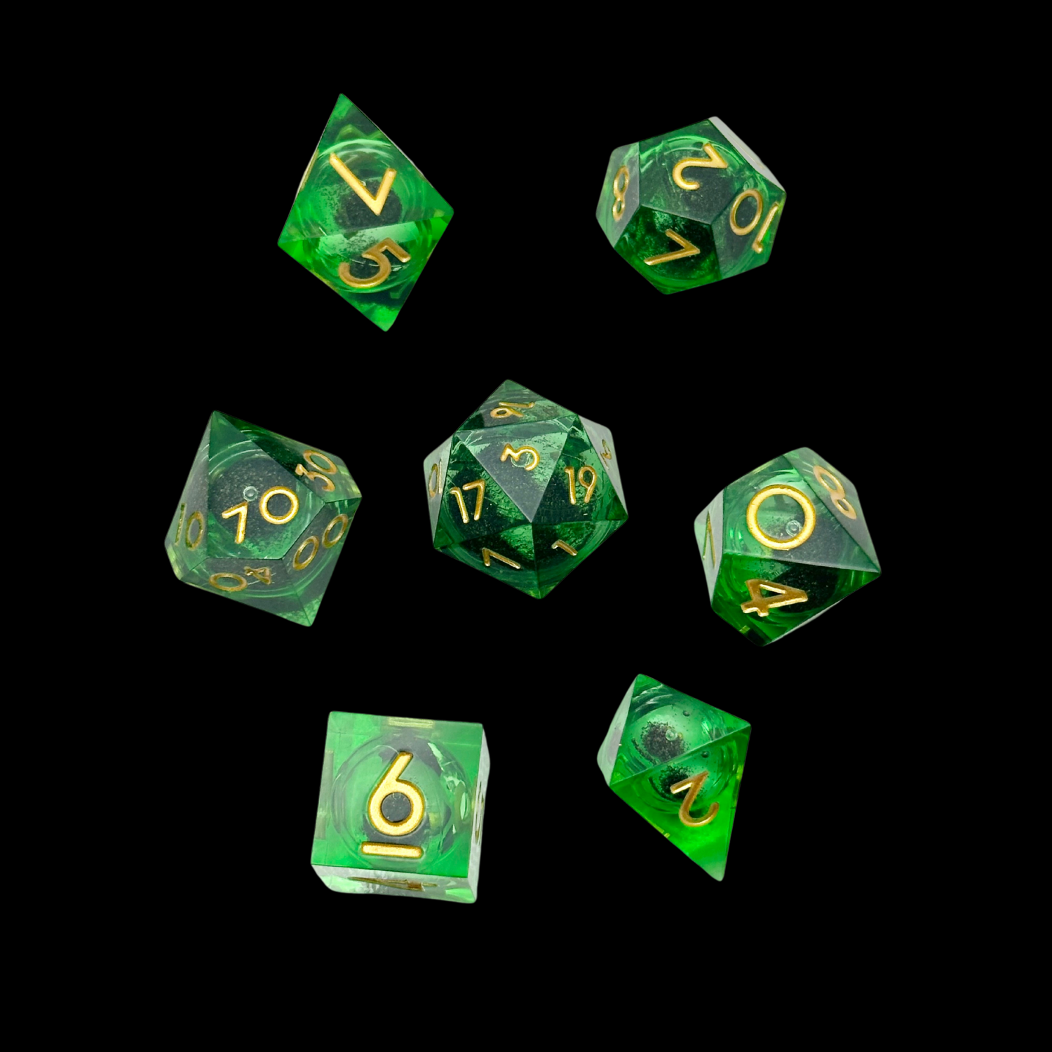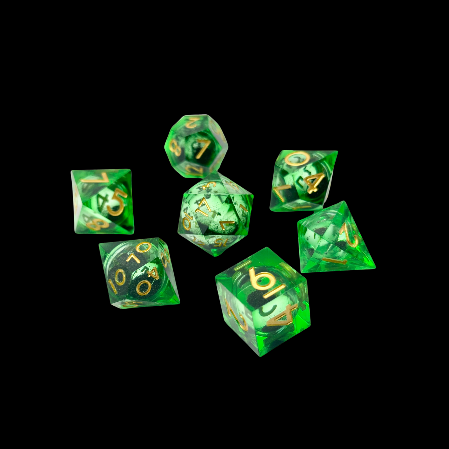 Jeu de dés Donjons et Dragons en résine à noyau liquide vert/or/noir