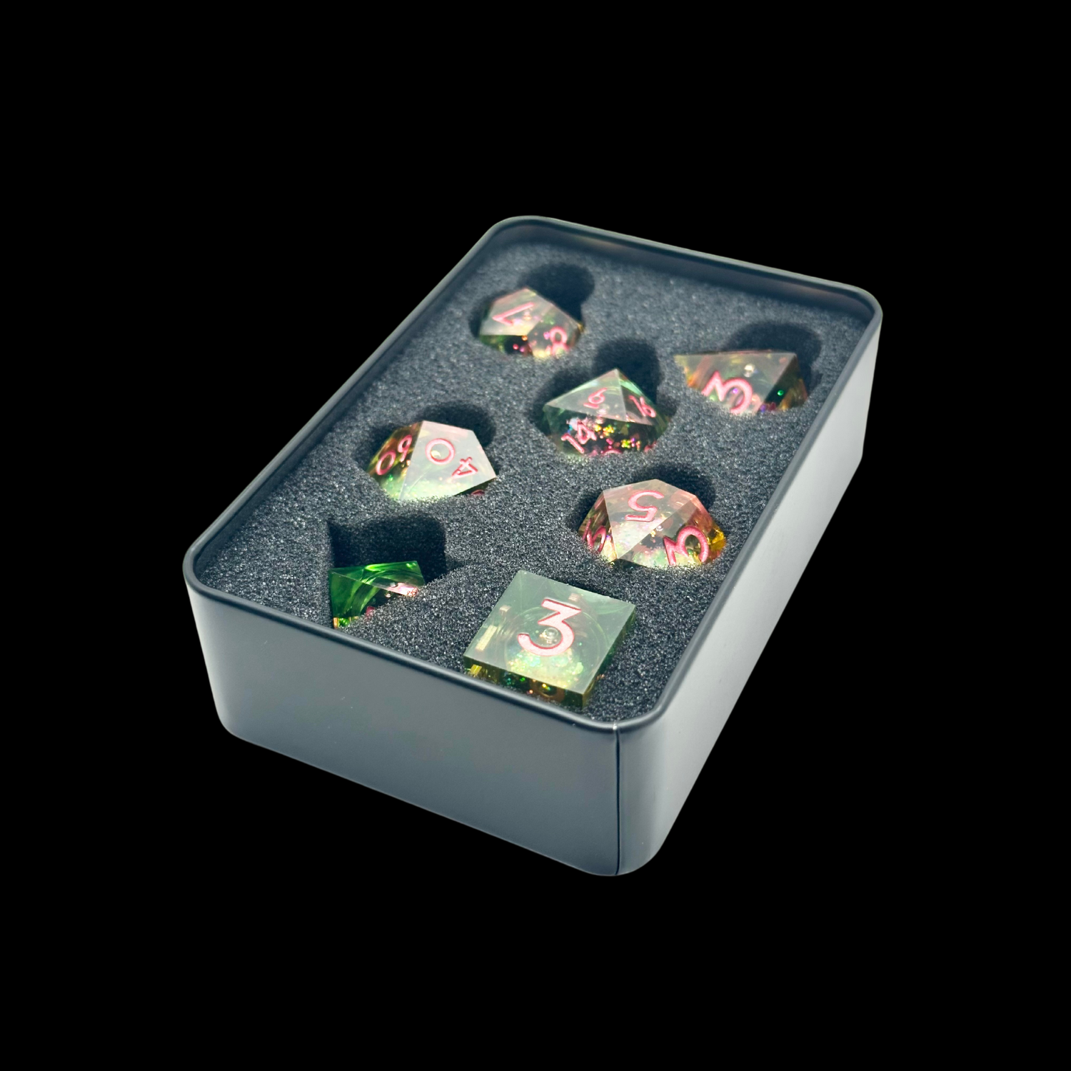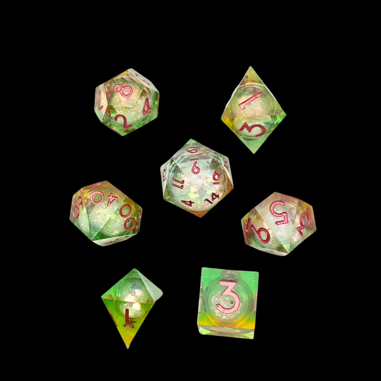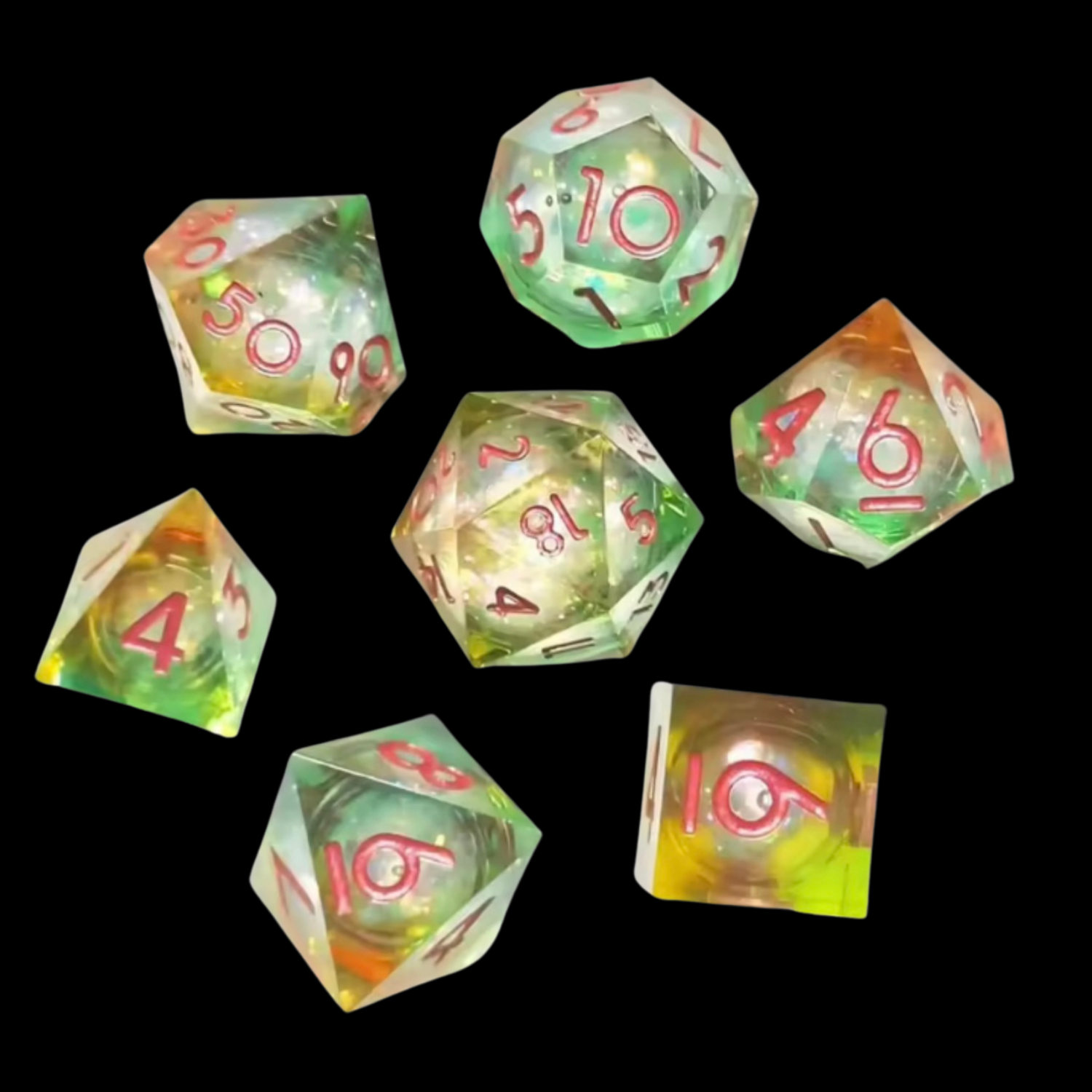 Jeu de dés Donjons et Dragons en résine à noyau liquide vert/rose/orange