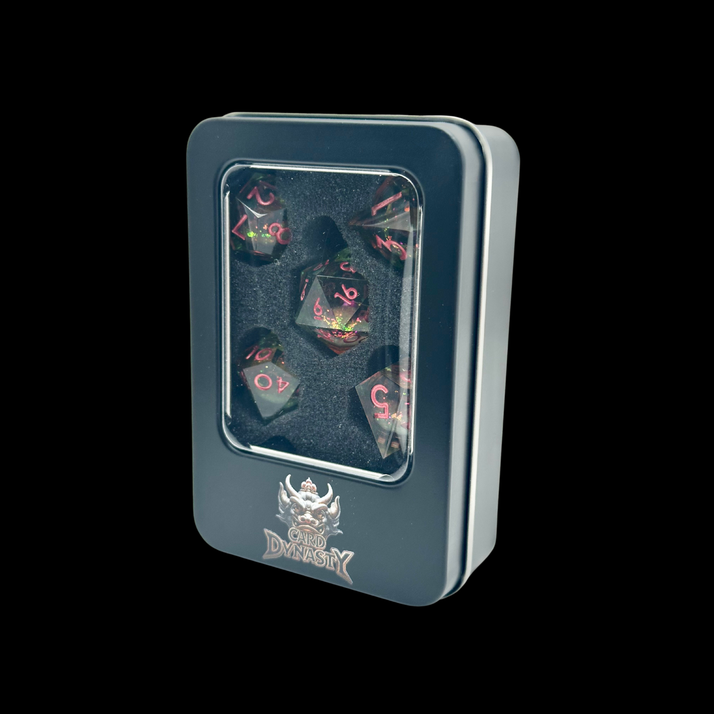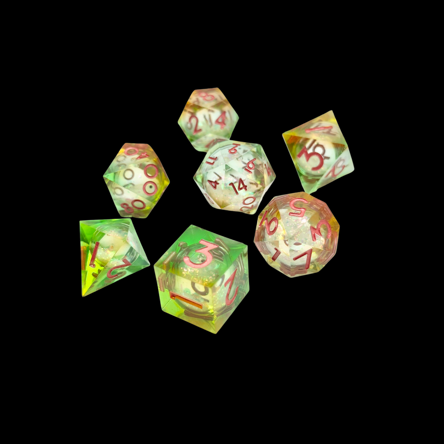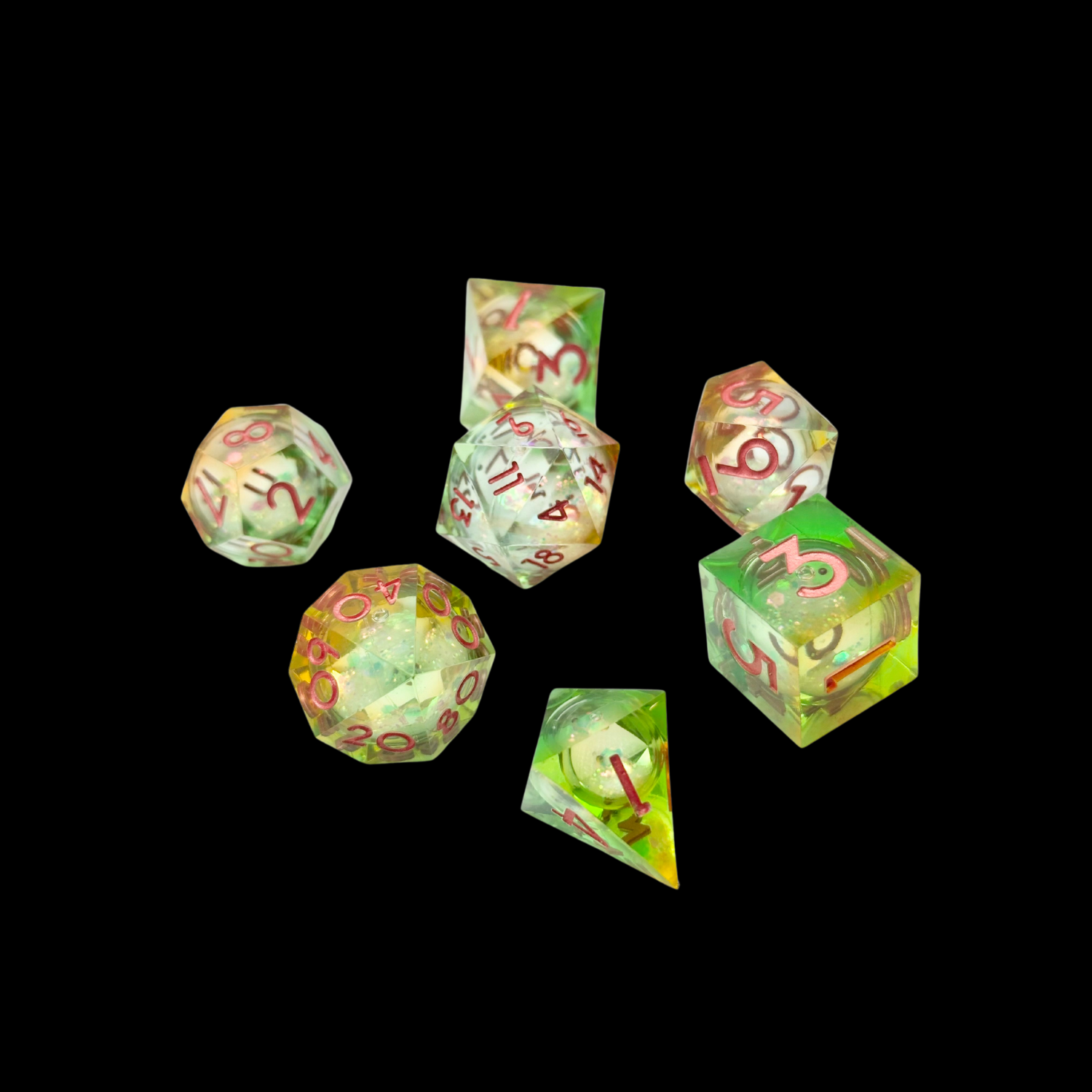 Jeu de dés Donjons et Dragons en résine à noyau liquide vert/rose/orange