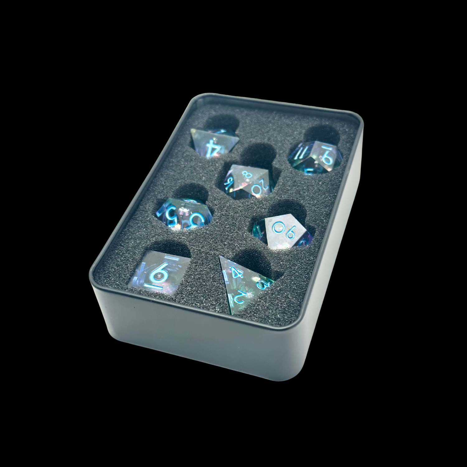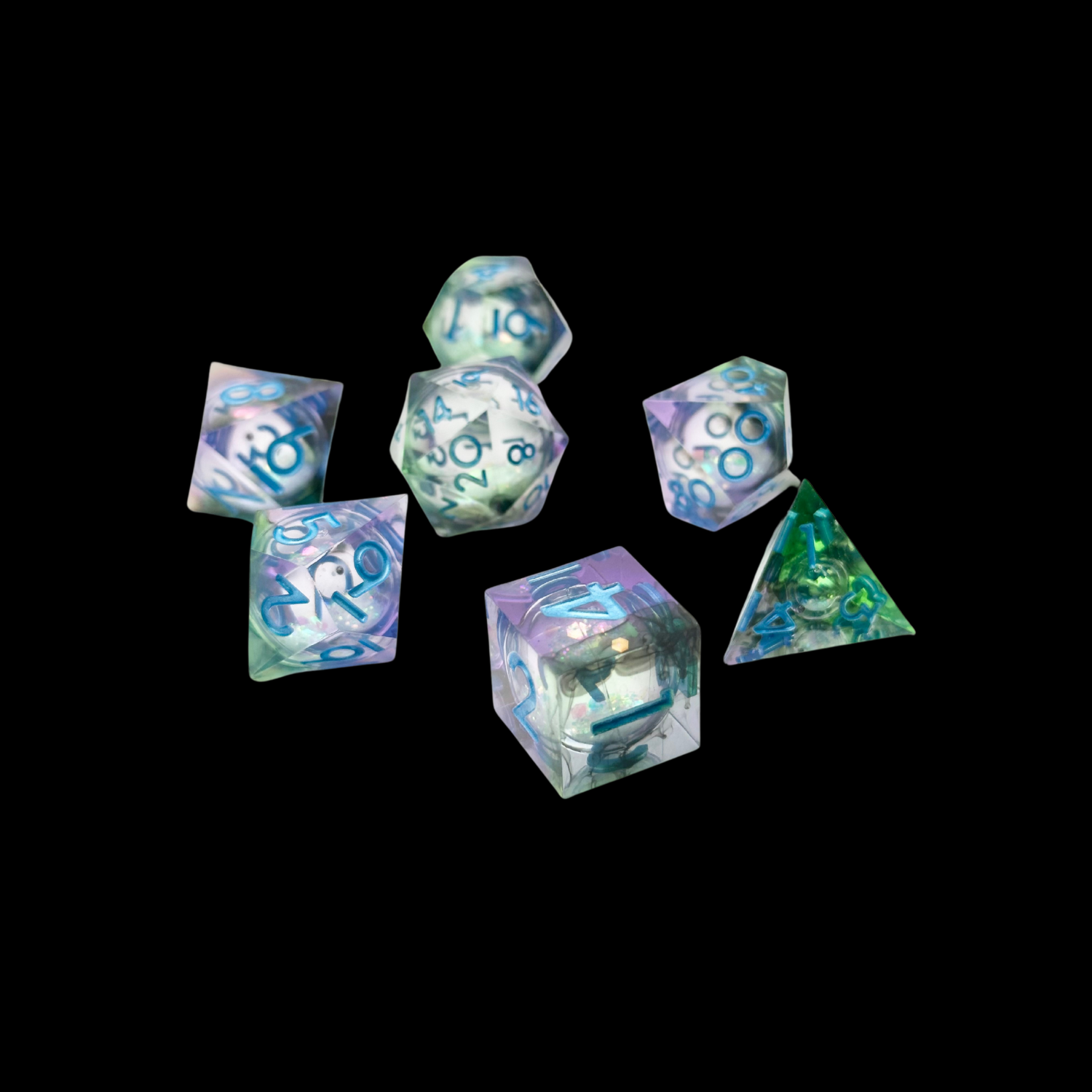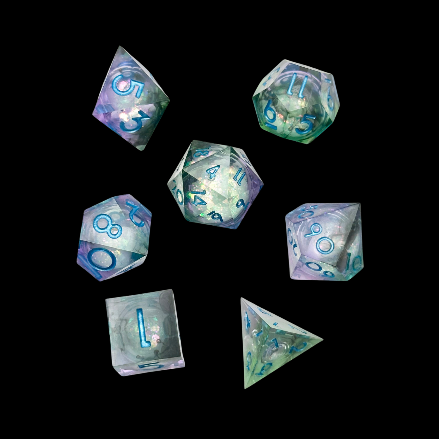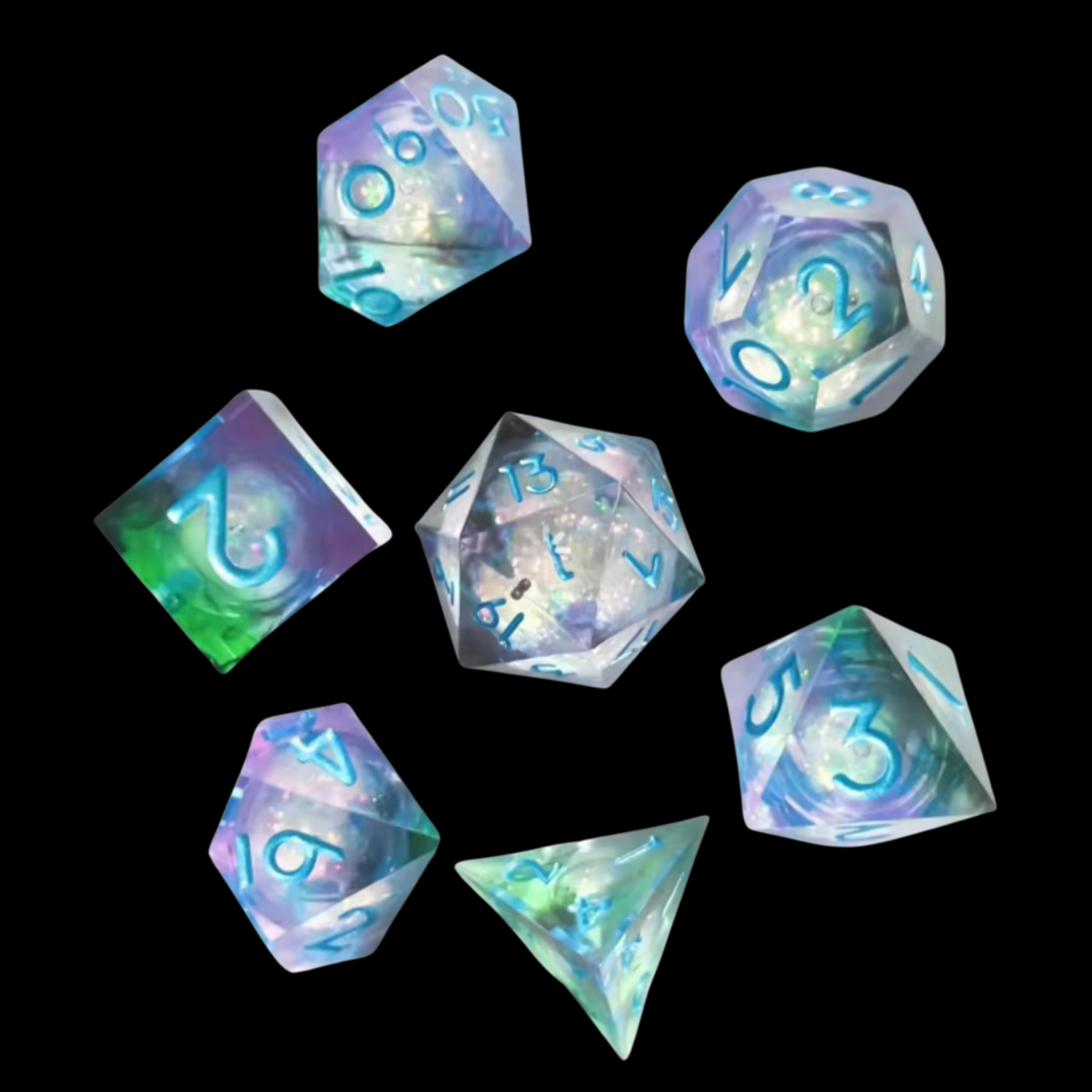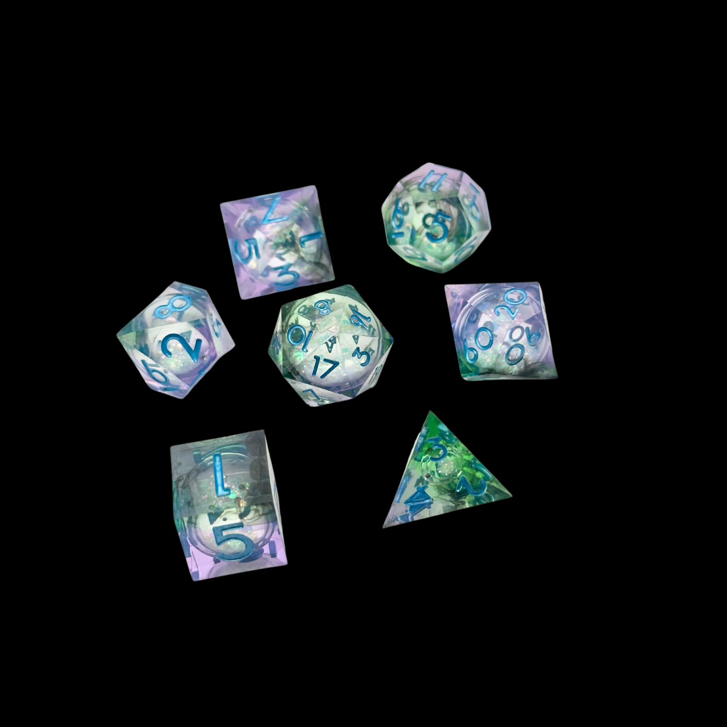 Jeu de dés Donjons et Dragons en résine à noyau liquide bleu/vert