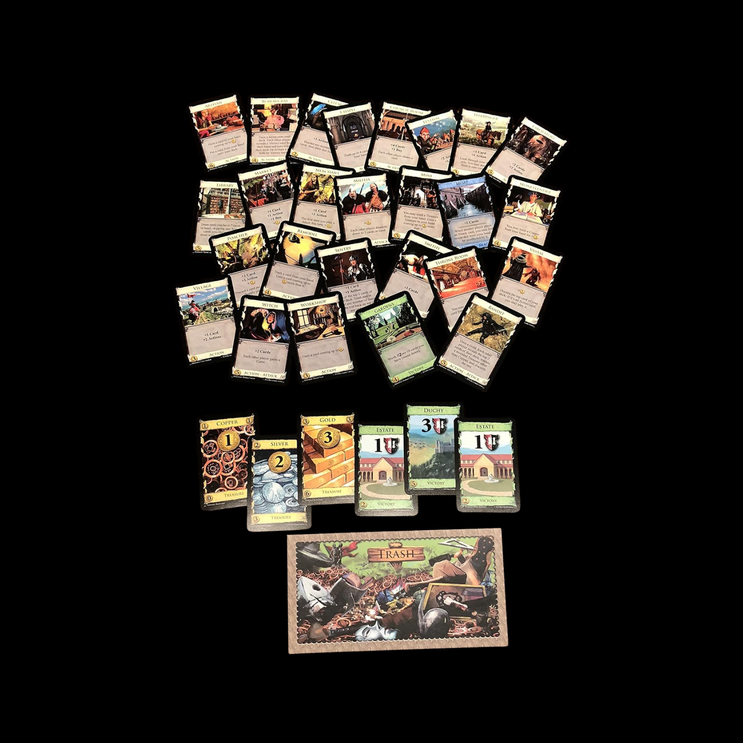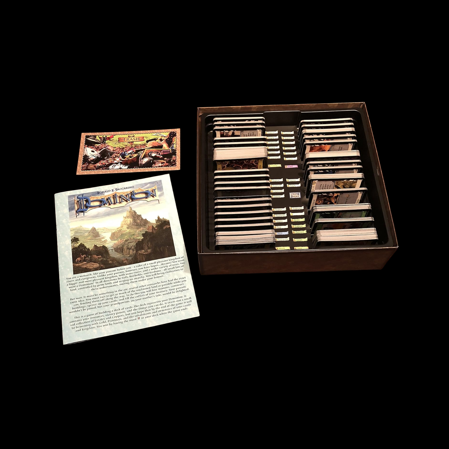 Dominion est, thématiquement, un jeu de cartes sur les monarques qui tentent d’étendre leur royaume. Mécaniquement, c’est un jeu de construction de deck où les joueurs achètent des cartes à chaque tour pour ajouter à leurs decks, devenant lentement plus puissant au fur et à mesure que le jeu progresse.