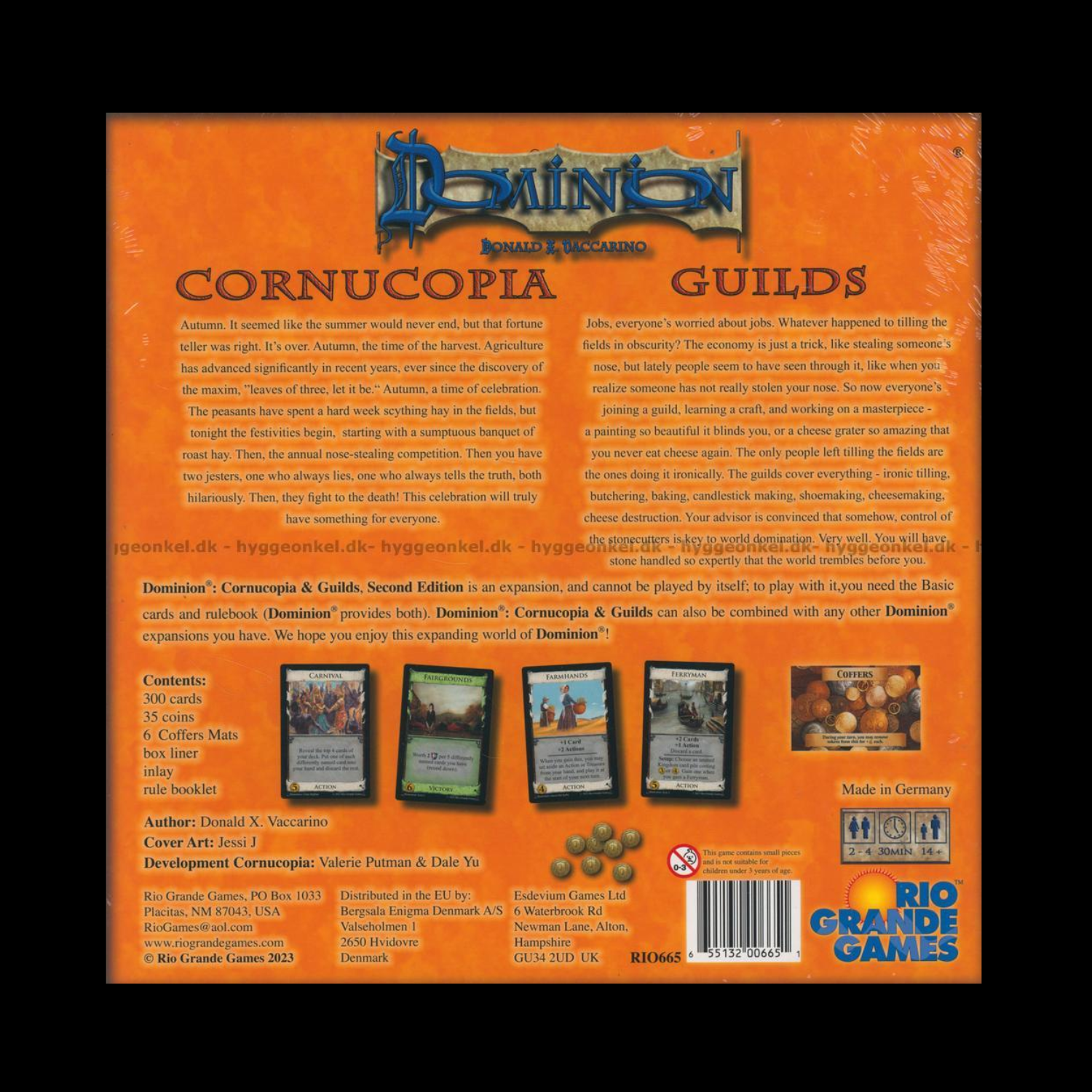 Cette boîte combine les 5ème (Cornucopia) et 8ème (Guildes) extensions du Dominion. Ensemble, elles ajoutent 26 nouvelles cartes de Royaume au Dominion. Le thème central de Cornucopia est la variété, tandis que les guildes ont des jetons en pièces que vous pouvez économiser et dépenser plus tard, et des cartes dont vous tirez le meilleur parti en payant un supplément pour elles. Dominion : Cornucopia & Les guildes ne peuvent pas être jouées seules ; pour jouer avec, vous avez besoin des cartes de base et du livre de règles (Dominion fournit