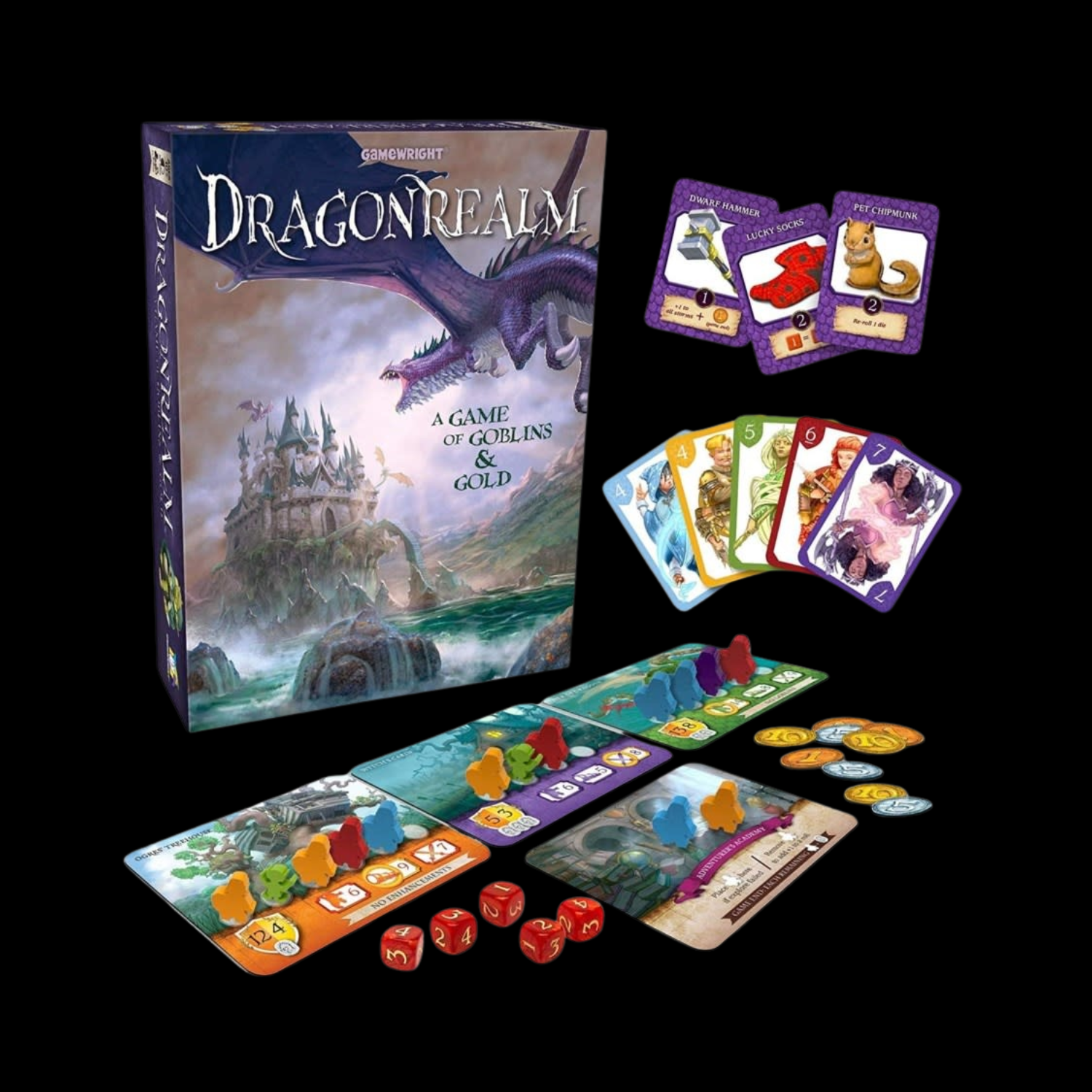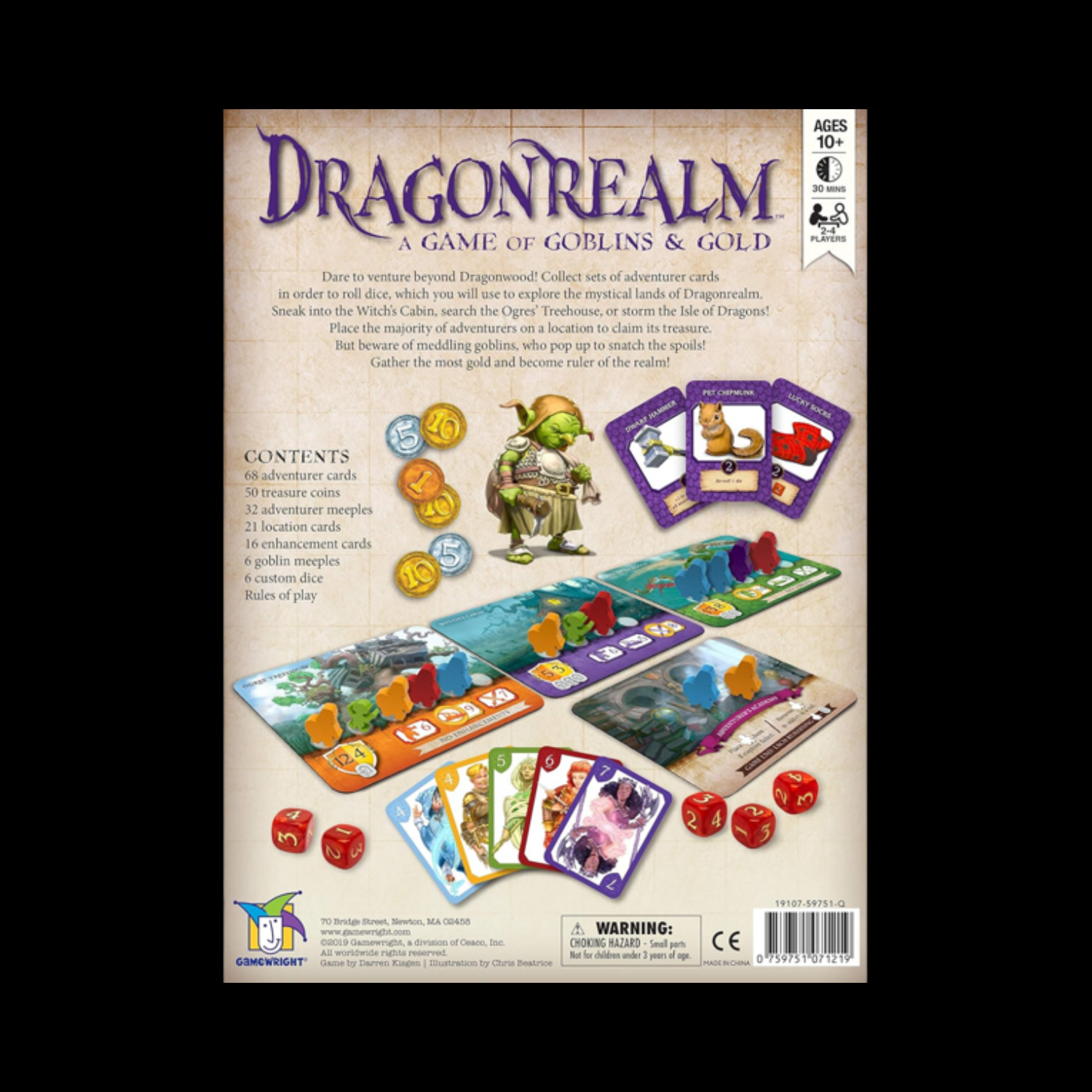 Osez vous aventurer au-delà de Bois-dragon ! Collectez des ensembles de cartes d’aventurier afin de lancer les dés, que vous utiliserez pour explorer les terres mystiques de Dragonrealm. Se faufiler dans la cabane de la sorcière, chercher la cabane de l’ogre ou prendre d’assaut l’île des dragons ! Placez la majorité des aventuriers sur un emplacement pour réclamer son trésor. Mais méfiez-vous des gobelins intrusifs, qui surgissent pour prendre le butin ! Rassemblez le plus d’or et devenez souverain du royaume !