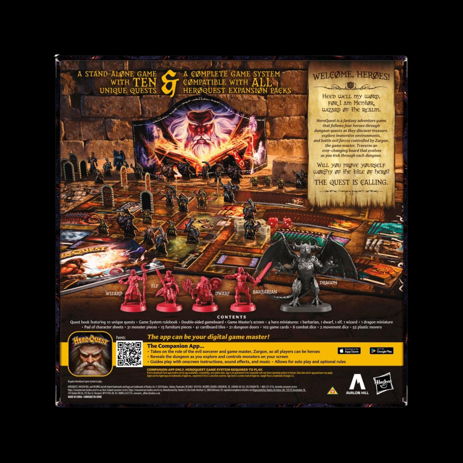 APPLICATION COMPAGNE GRATUITE : L’application peut être votre maître de jeu numérique ! Elle joue le rôle de Zargon, donc tous les joueurs peuvent être des héros ou vous pouvez jouer en solo. Pour télécharger, scannez le code sur la boîte. (Application d’accompagnement uniquement. Système de jeu HeroQuest requis pour jouer.)