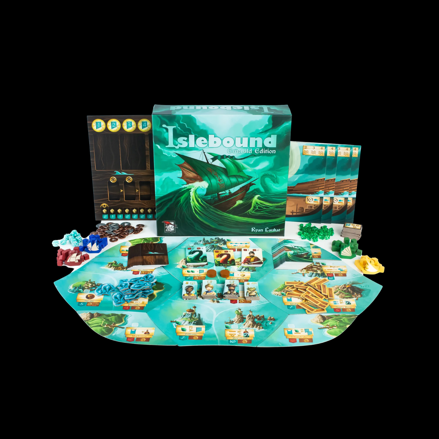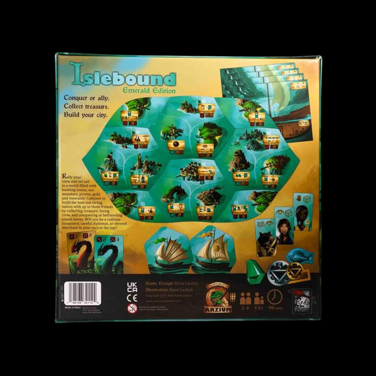Islebound : Emerald Edition est une édition spéciale du jeu avec des composants et des règles modifiés. Il est préférable de le considérer comme une variante du jeu, plutôt que comme une 2e édition. Islebound : Emerald Edition Upgrade Pack était disponible pour les propriétaires de l’édition originale. Les pièces en métal et les navires en bois peints étaient également disponibles séparément, Islebound : Emerald Edition Deluxe Components.