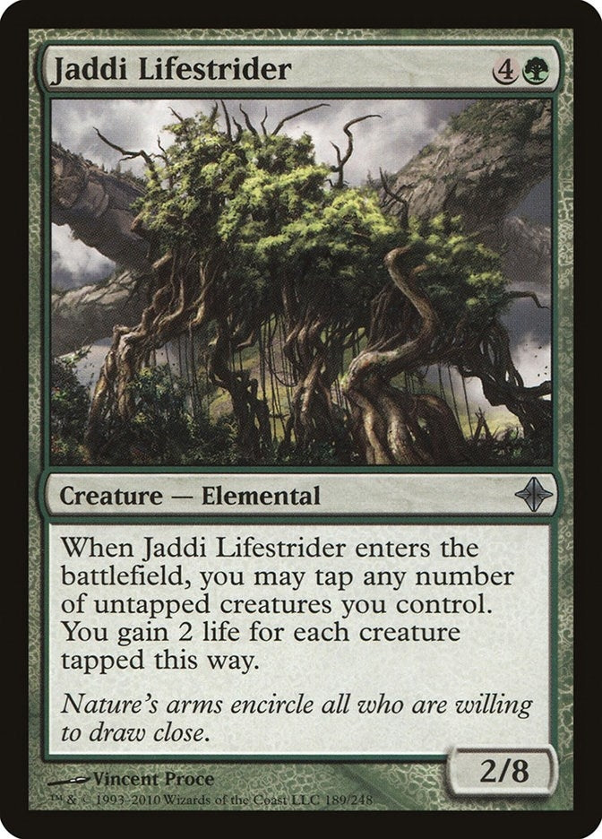 | Rules Text Contains: | When Jaddi Lifestrider enters the battlefield, you may tap any number of untapped creatures you control. You gain 2 life for each creature tapped this way. |