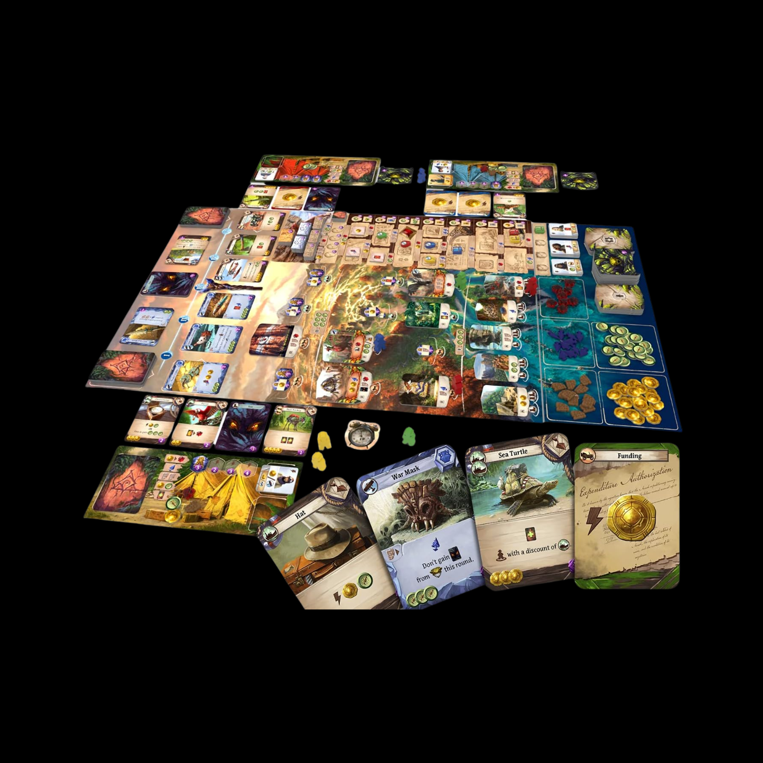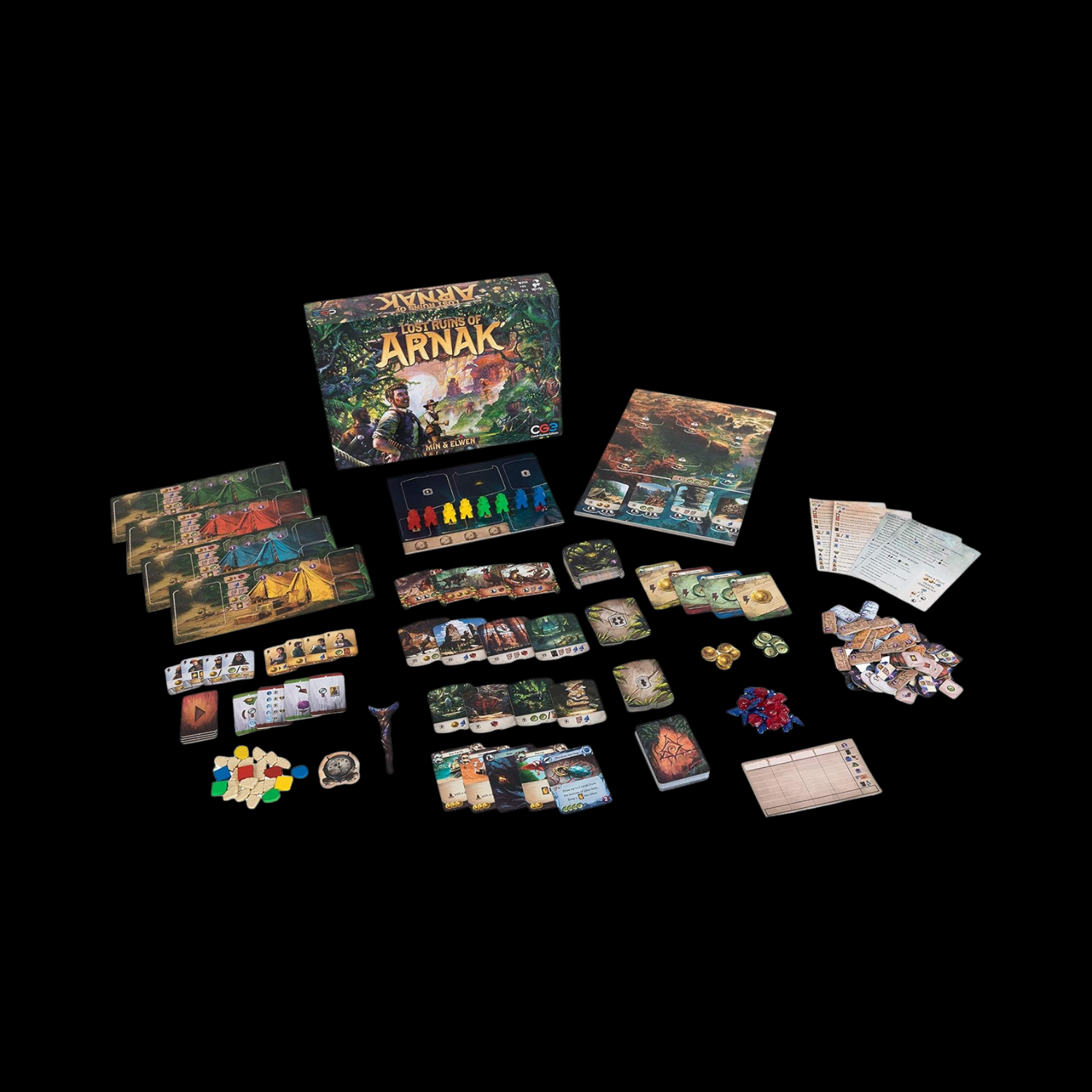 Lost Ruins of Arnak combine la construction de deck et le placement des travailleurs dans un jeu d’exploration, de gestion des ressources et de découverte. En plus des effets de constructeur de deck traditionnels, les cartes peuvent également être utilisées pour placer des ouvriers, et de nouvelles actions d’ouvrier deviennent disponibles à mesure que les joueurs explorent l’île. Certaines de ces actions nécessitent des ressources au lieu de travailleurs, donc construire une base de ressources solide sera essentiel. Vous êtes limité à une seule action par tour, alors faites votre choix avec soin... quelle action vous sera la plus bénéfique maintenant ? Et que pouvez-vous vous permettre de faire plus tard... en supposant que quelqu’un d’autre ne prenne pas l’action en premier !?