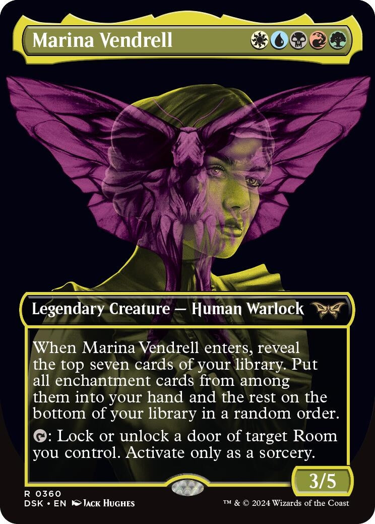 | Rules Text Contains: | When Marina Vendrell enters, reveal the top seven cards of your library. Put all enchantment cards from among them into your hand and the rest on the bottom of your library in a random order.