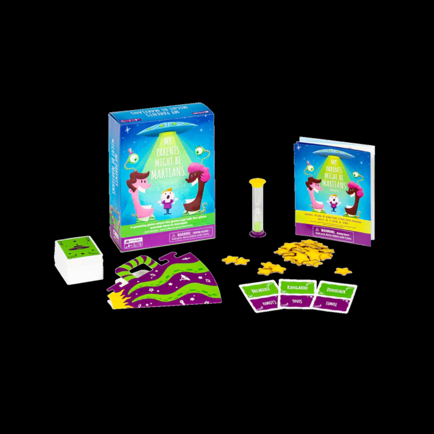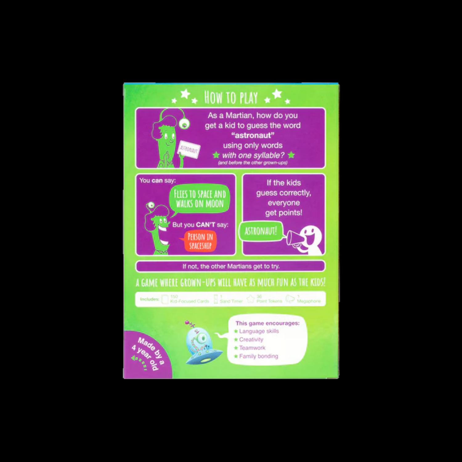 L’objectif est que les Martiens fassent deviner un mot à leurs amis humains en utilisant uniquement des indices avec des mots d’une seule syllabe. Les humains doivent travailler ensemble pour donner un sens à ton discours idiot avant que le temps ne soit écoulé. Ce jeu est une façon hors du commun d’améliorer le travail d’équipe et les compétences linguistiques de vos petits.