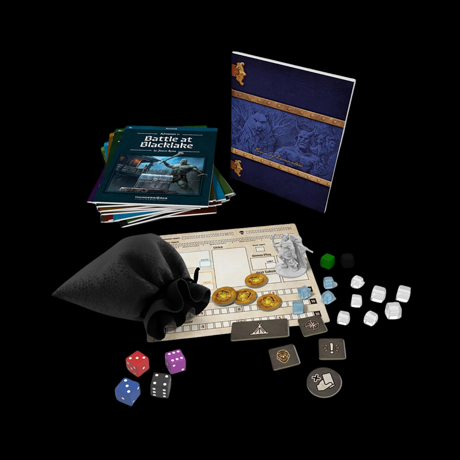 116 Marqueurs (50 petits marqueurs d’endurance, 20 grands marqueurs d’endurance, 1 marqueur de groupe, 3 marqueurs de faveur, 3 marqueurs ronds, 40 marqueurs XP)