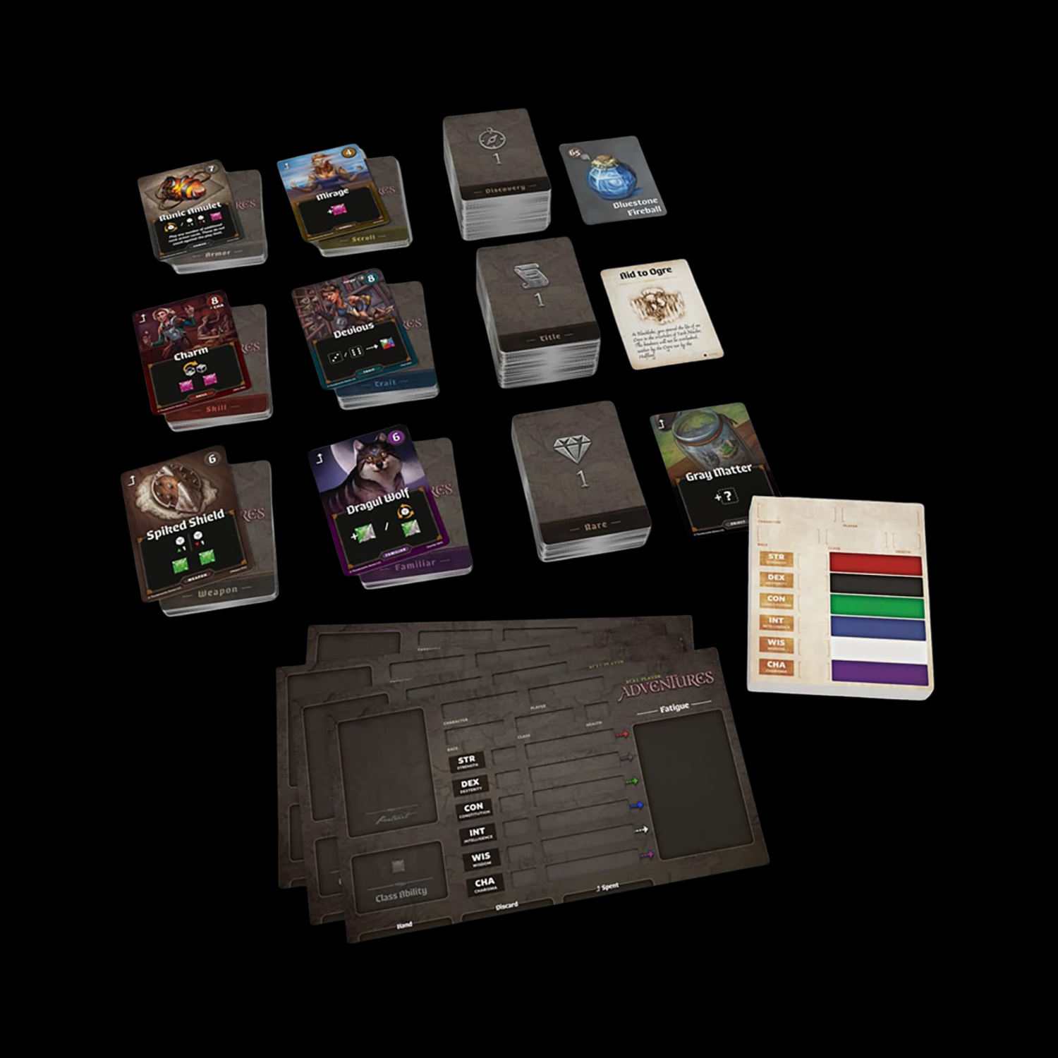 144 cartes de marché (23 armures, 25 compétences, 26 armes, 19 parchemins, 36 traits, 15 familiers)