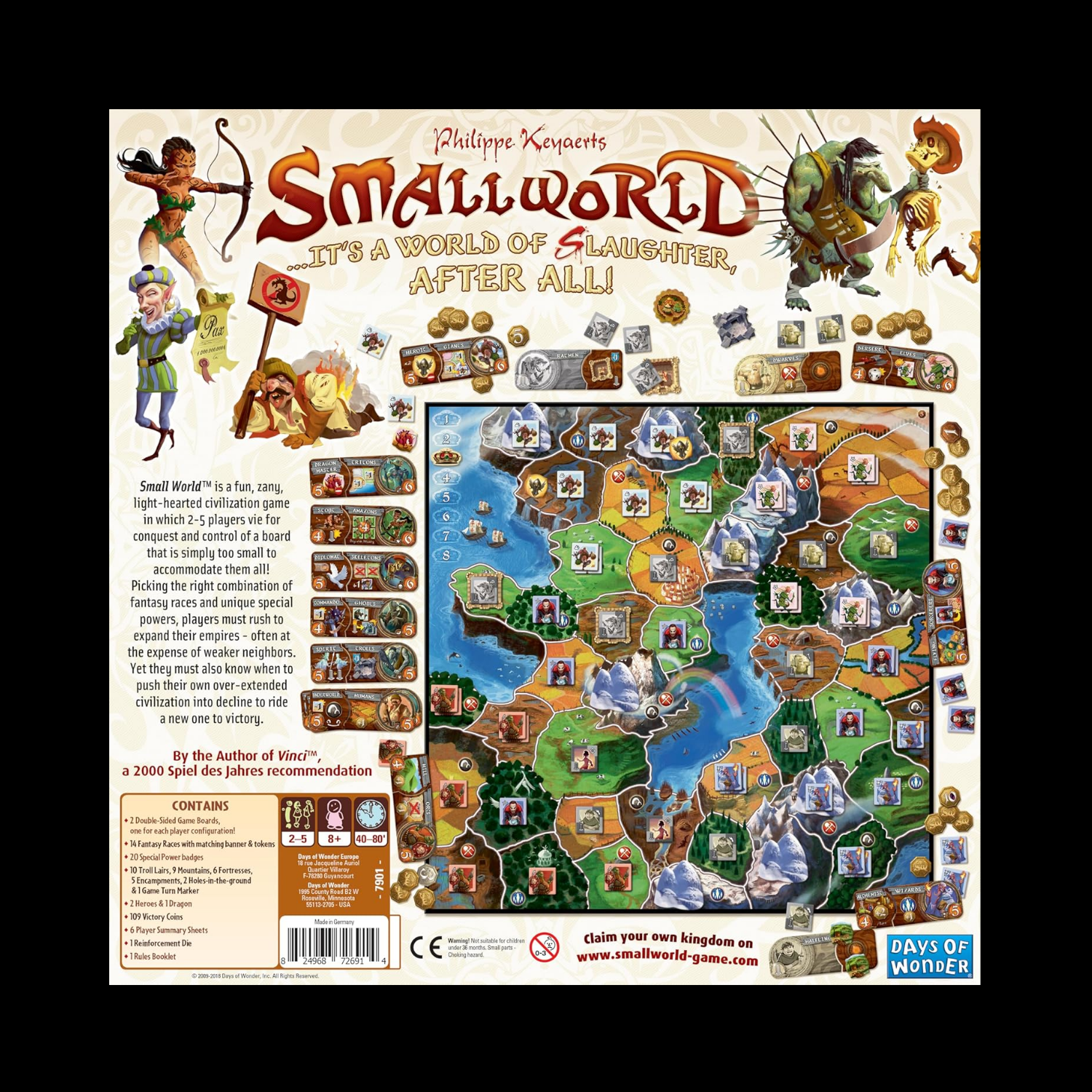 Dans Small World, les joueurs se disputent la conquête et le contrôle d’un monde qui est tout simplement trop petit pour tous les accueillir. Les joueurs se précipitent pour étendre leurs empires, occuper des territoires et conquérir des terres adjacentes afin de repousser les autres races hors de la surface de la terre. Pourtant, ils doivent aussi savoir quand abandonner leur propre civilisation et chevaucher une nouvelle vers la victoire !