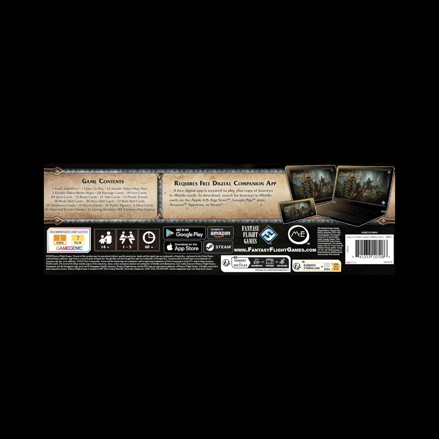 Embarquez pour vos propres aventures dans le monde emblématique de J.R.R. Tolkien avec The Lord of the Rings : Journeys in Middle-earth, un jeu de société entièrement coopératif et soutenu par une application pour un à cinq joueurs ! Vous combattrez des ennemis maléfiques, ferez des choix courageux et porterez un coup contre le mal qui menace la terre—tout cela dans le cadre d’une campagne palpitante qui vous mènera à travers les collines et les vallées de la Terre du Milieu.