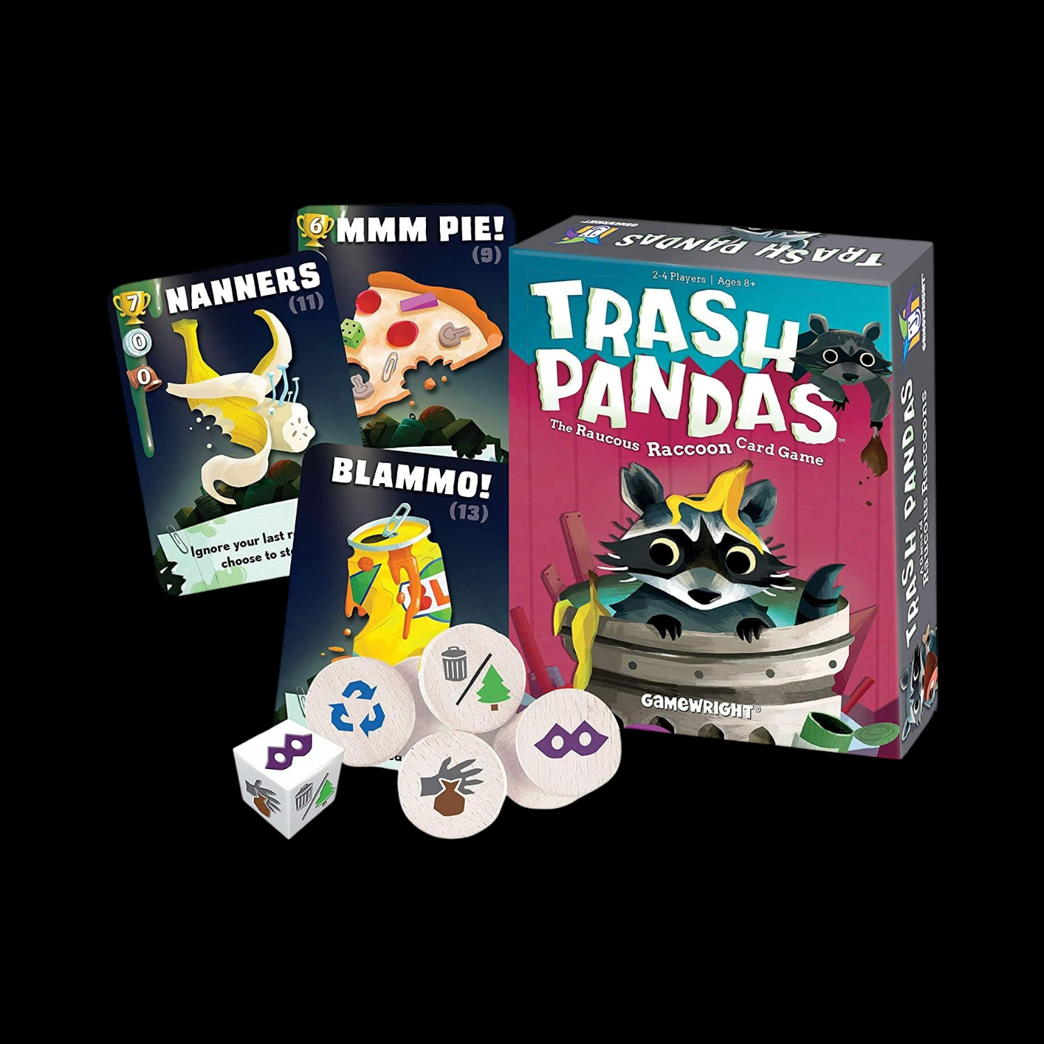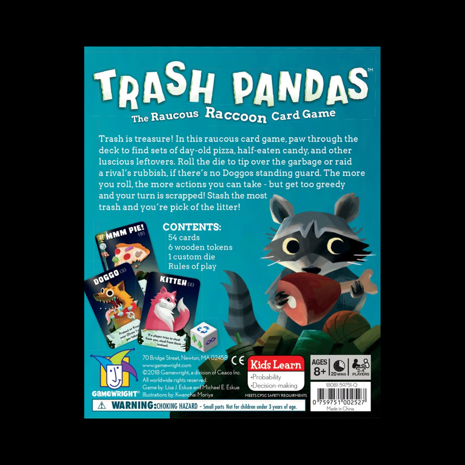 Trash is treasure! Dans ce jeu de cartes bruyant, fouillez le paquet pour trouver des ensembles de pizzas d’un jour, de bonbons à moitié mangés et d’autres restes succulents. Lance le dé pour faire basculer les ordures ou piller les déchets d’un rival, s’il n’y a pas de Doggos qui montent la garde. Plus tu roules, plus tu peux faire des actions - mais deviens trop gourmand et c’est ton tour d’être mis au rebut ! Planque le plus de déchets et tu choisis parmi les déchets !