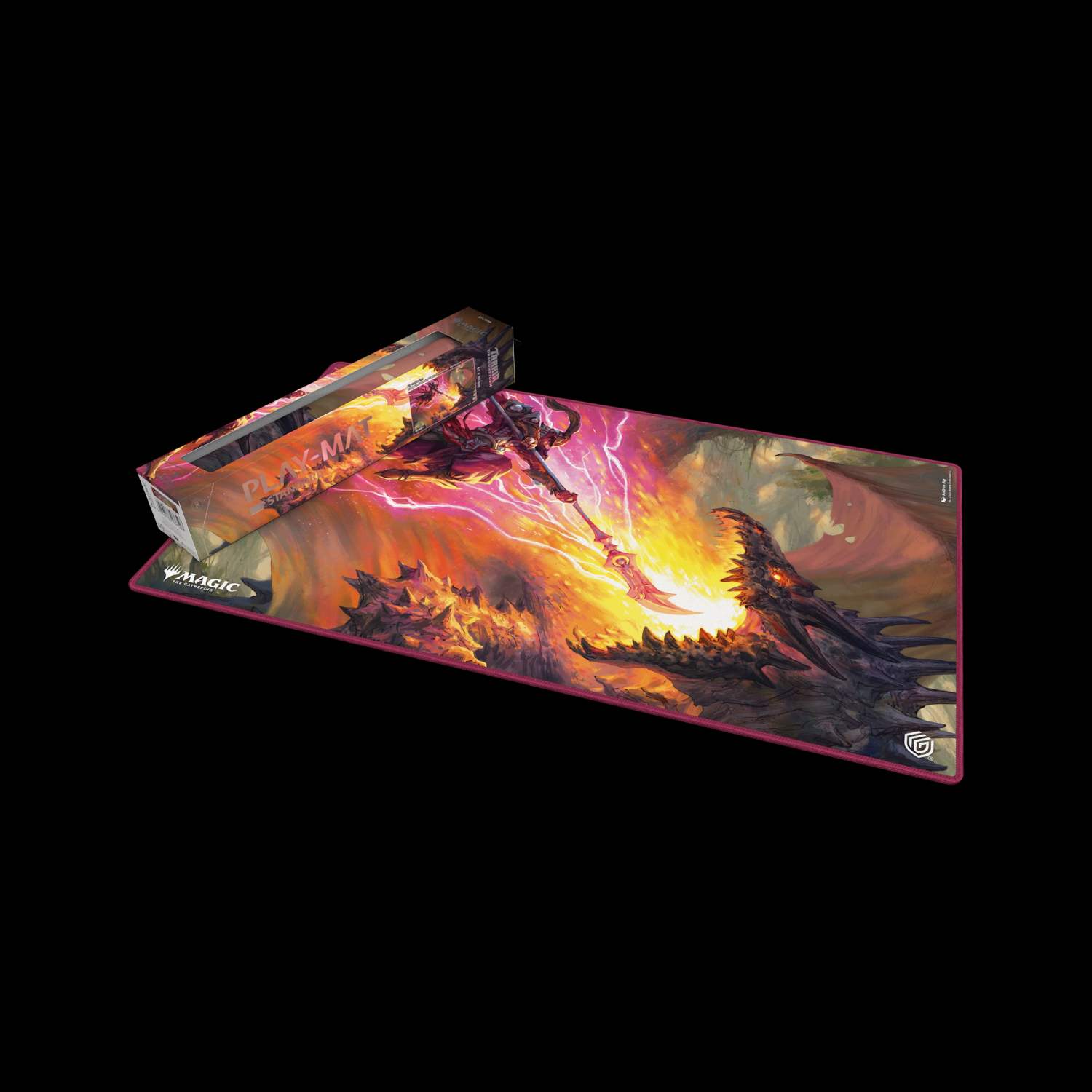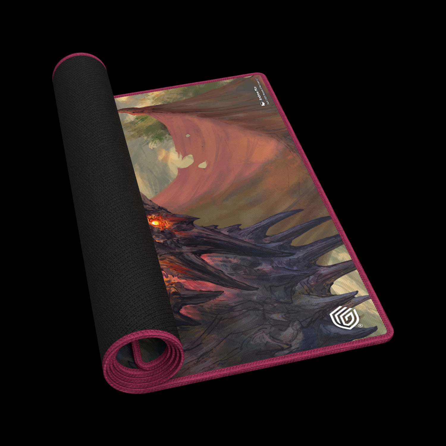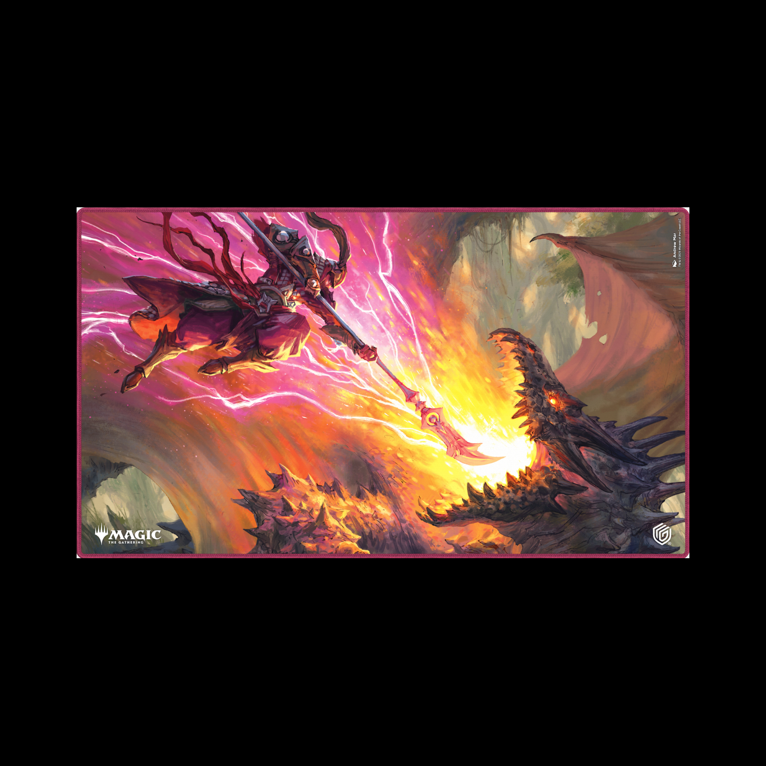 Le tapis de jeu 61x35cm protège les cartes et les manches pendant le jeu et améliore l’expérience de jeu grâce à son dessous antidérapant, tandis que les bords cousus garantissent une durée de vie encore plus longue. La face supérieure du tapis de jeu est imprimée avec des œuvres d’art sous licence officielle de l’ensemble « Tarkir: Dragonstorm » de Magic : The Gathering.