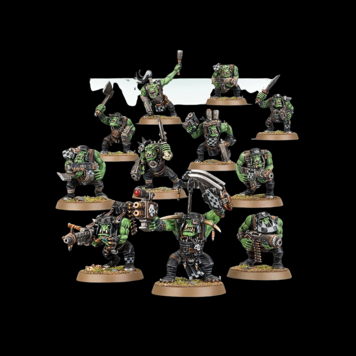 Ce coffret contient 11 Ork Boyz en plastique à plusieurs pièces, et comprend des options pour les sluggas, choppas, shootas, armes lourdes et stikk bombz. Modèles fournis avec des bases rondes de 32 mm.