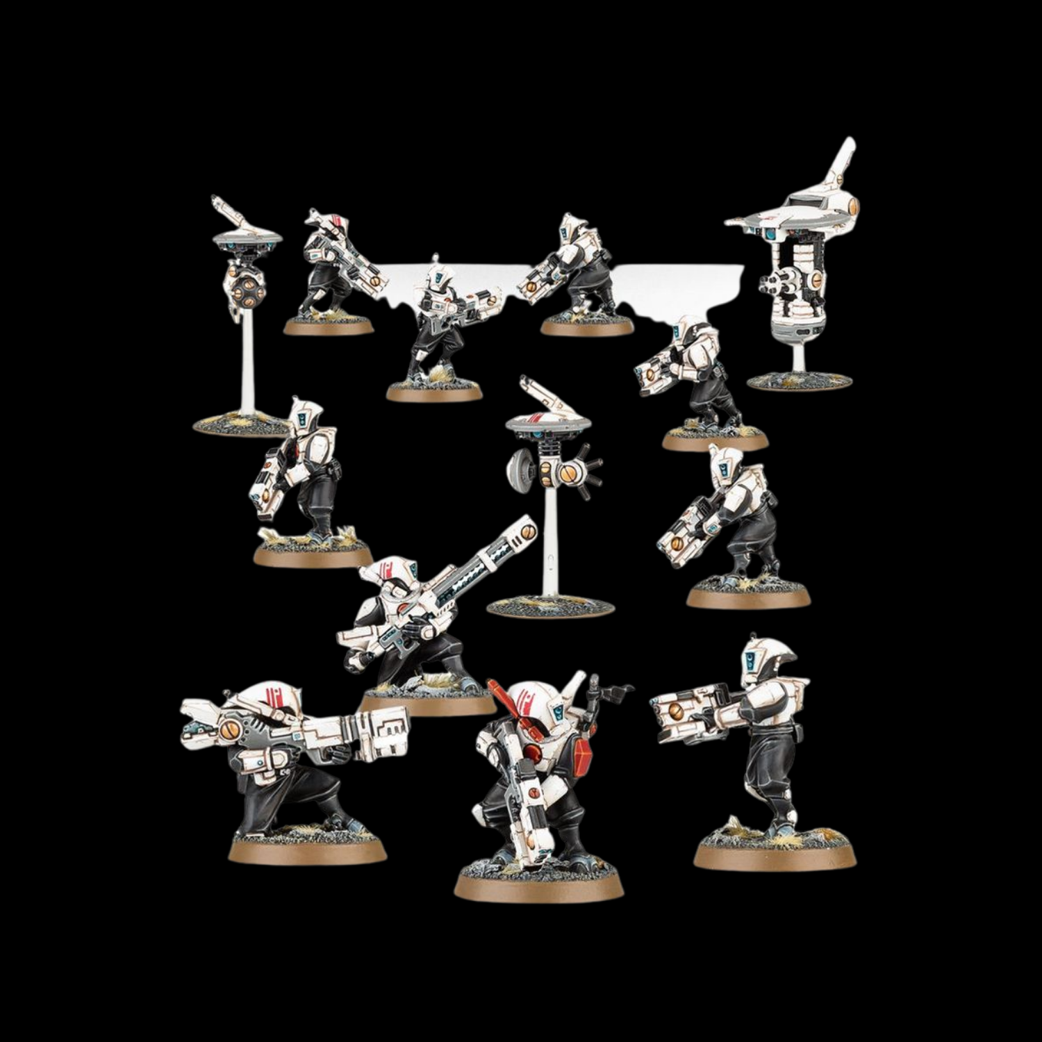 Ce kit plastique en plusieurs parties contient 137 composants avec lesquels fabriquer 10 T’au Pathfinders, un Pulse Accelerator Drone, un Grav-inhibitor Drone et un Recon Drone.