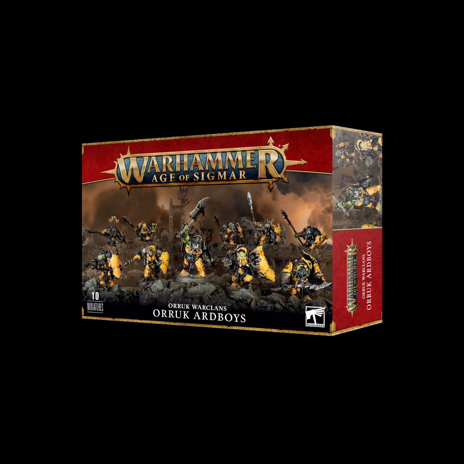 Ce kit plastique en plusieurs parties construit 10 Orruk Ardboyz, les combattants de première ligne des clans Ironjawz. Chaque Ardboy porte un bouclier lourd en forme de dalle, et peut être armé soit d’une choppa, soit d’un stikka à long manche. Vous pouvez construire un modèle en tant que Boss Ardboy pour diriger la foule avec une choppa unique et un choix de têtes, et un autre modèle en tant que Porteur de glyphe Gorkamorka qui porte l’un des deux glyphes différents montés sur le dos.