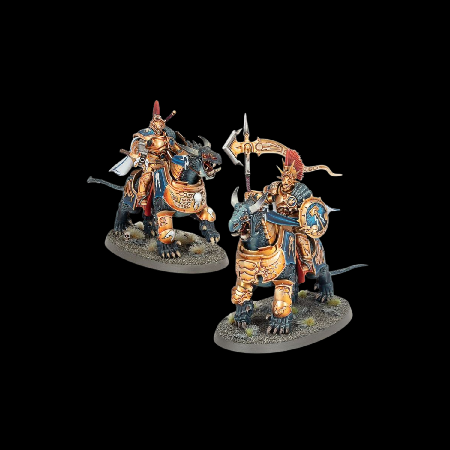 Ce kit plastique en plusieurs parties contient tous les composants nécessaires pour assembler deux Desolators de la Garde Dracothian, armés d’axes de foudre et de boucliers sigmarite et chacun monté sur un Dracoth féroce.