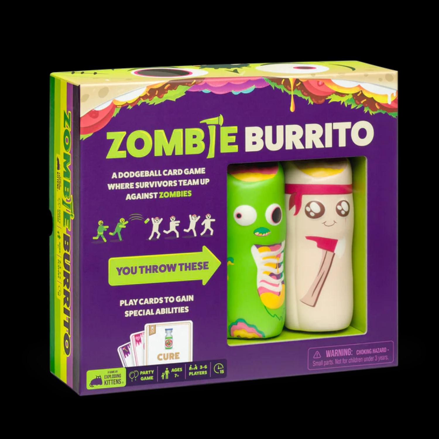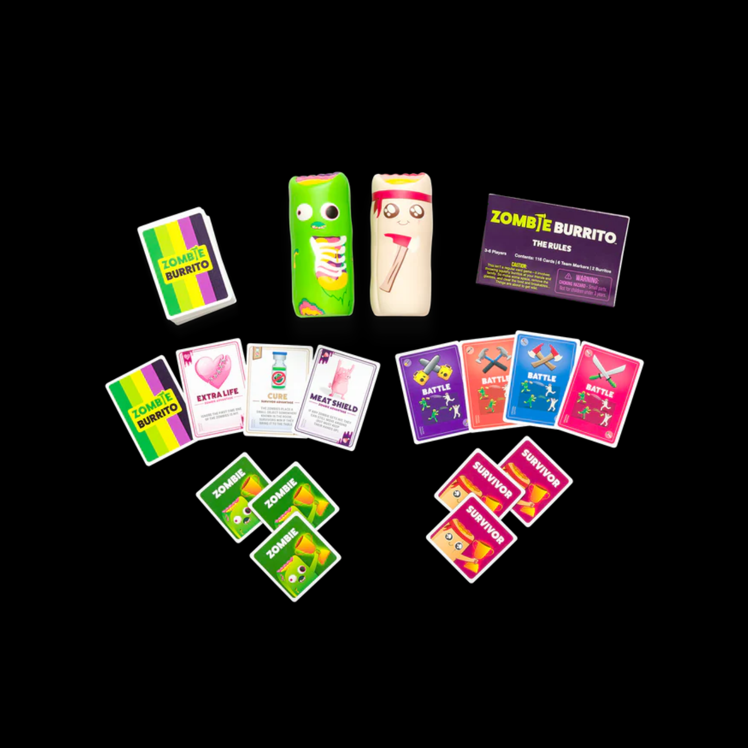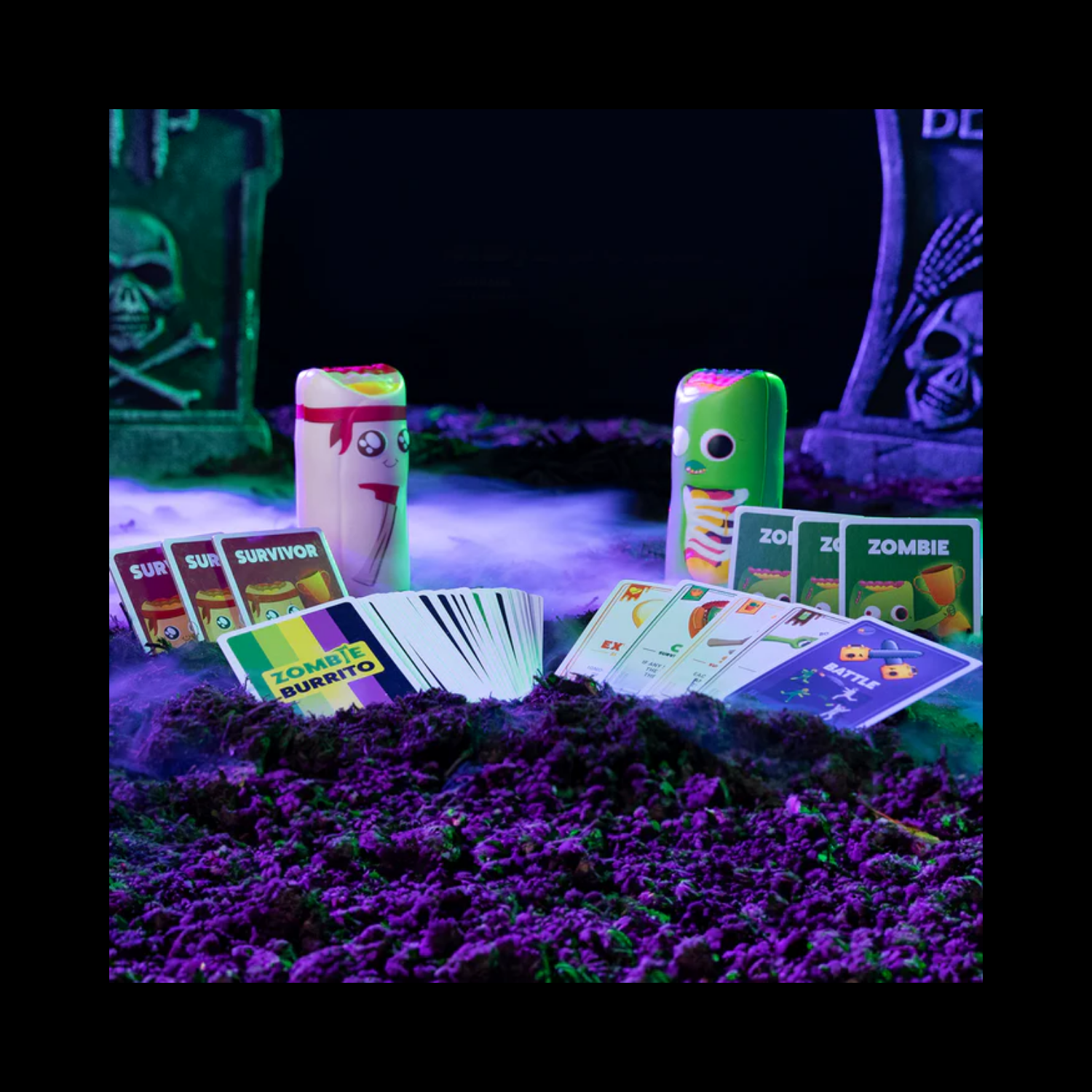 ATTENTION : Ce n’est pas un jeu de cartes normal. Vous devrez lancer des Squishy Foam Burritos à vos amis et à votre famille. Alors dégagez la zone, ramassez la table et tout ce qui pourrait se briser, et si vous avez des lunettes, enlevez-les, parce que cela va être fou.