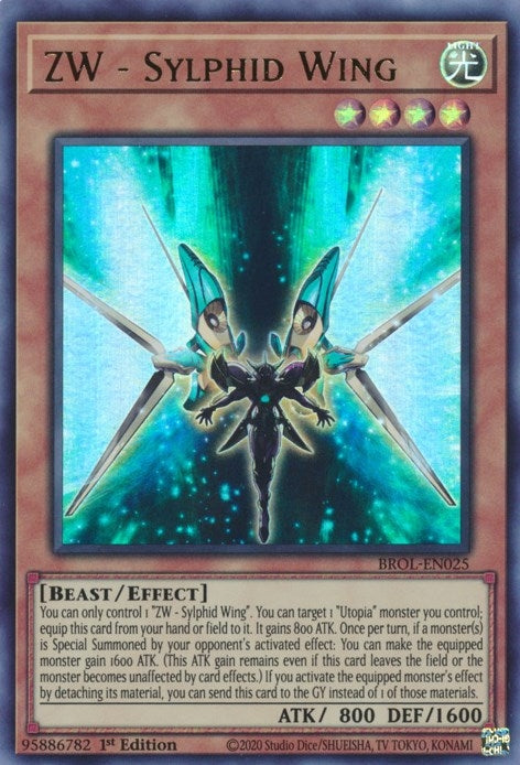 You can only control 1 "ZW - Sylphid Wing". You can target 1 "Utopia" monster you control; equip this card from your hand or field to it. It gains 800 ATK. Once per turn, if a monster(s) is Special Summoned by your opponent's activated effect: You can make the equipped monster gain 1600 ATK. (This ATK gain remains even if this card leaves the field or the monster becomes unaffected by card effects.) If you activate the equipped monster's effect by detaching its material, you can send this card to the GY instead of 1 of those materials.