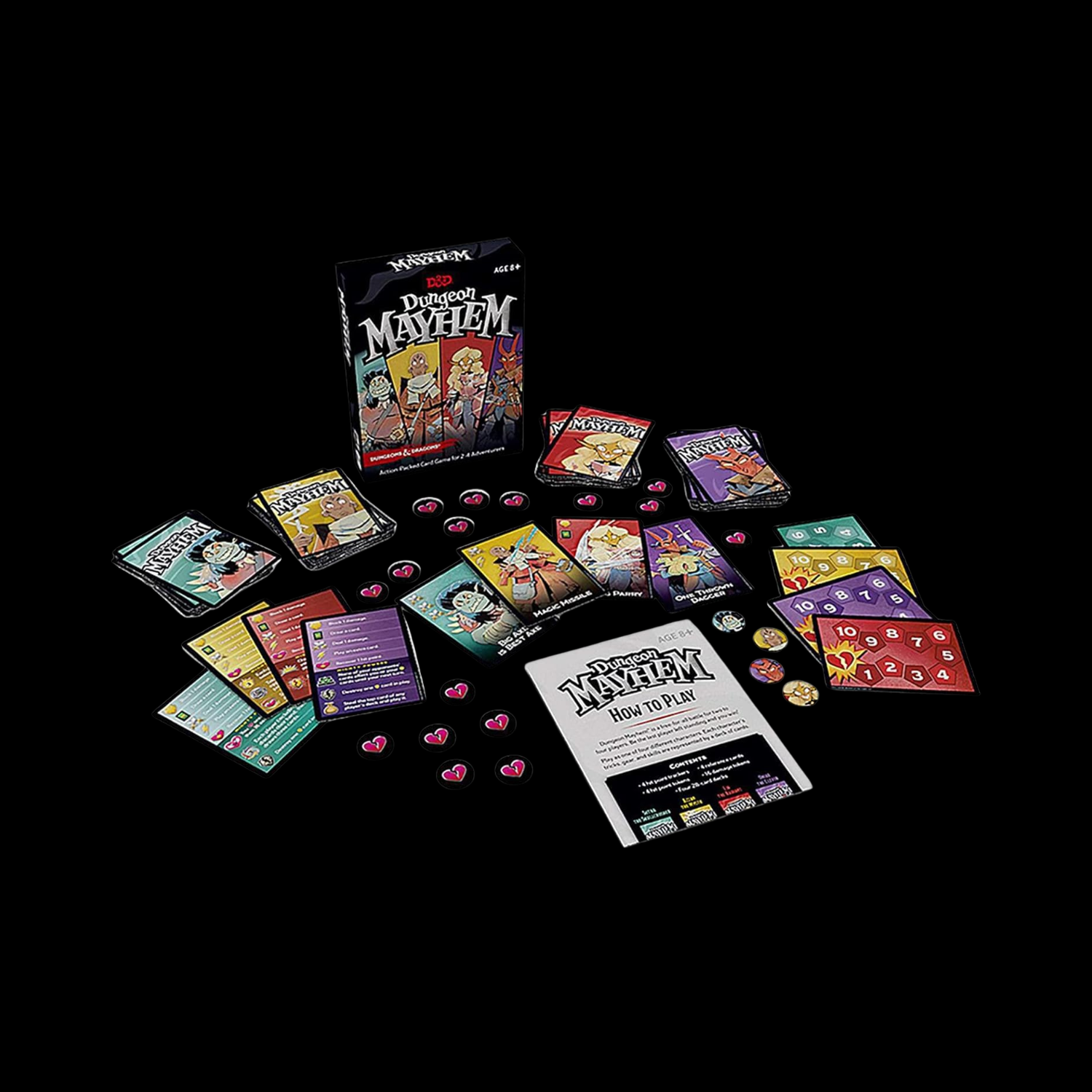 Dungeon Mayhem is an easy-to-learn card game pitting a party of adventurers against one another until only one of them remains to claim the treasure. The game includes four decks of cards to represent Sutha the Skullcrusher (barbarian), Azzan the Mystic (wizard), Lia the Radiant (paladin), and Oriax the Clever (rogue)