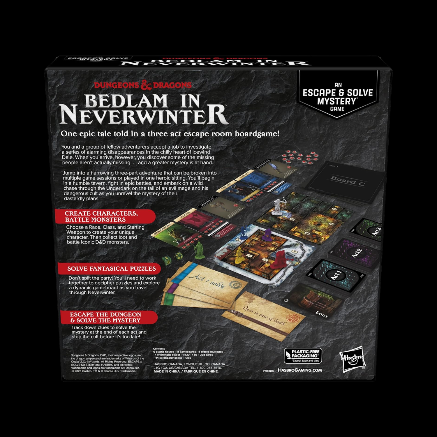 - ESCAPE THE DUNGEON, SOLVE THE MYSTERY: Dungeons & Dragons: Bedlam in Neverwinter offers all of the excitement of the beloved D&D game in one epic adventure, told in a 3-part escape room board game