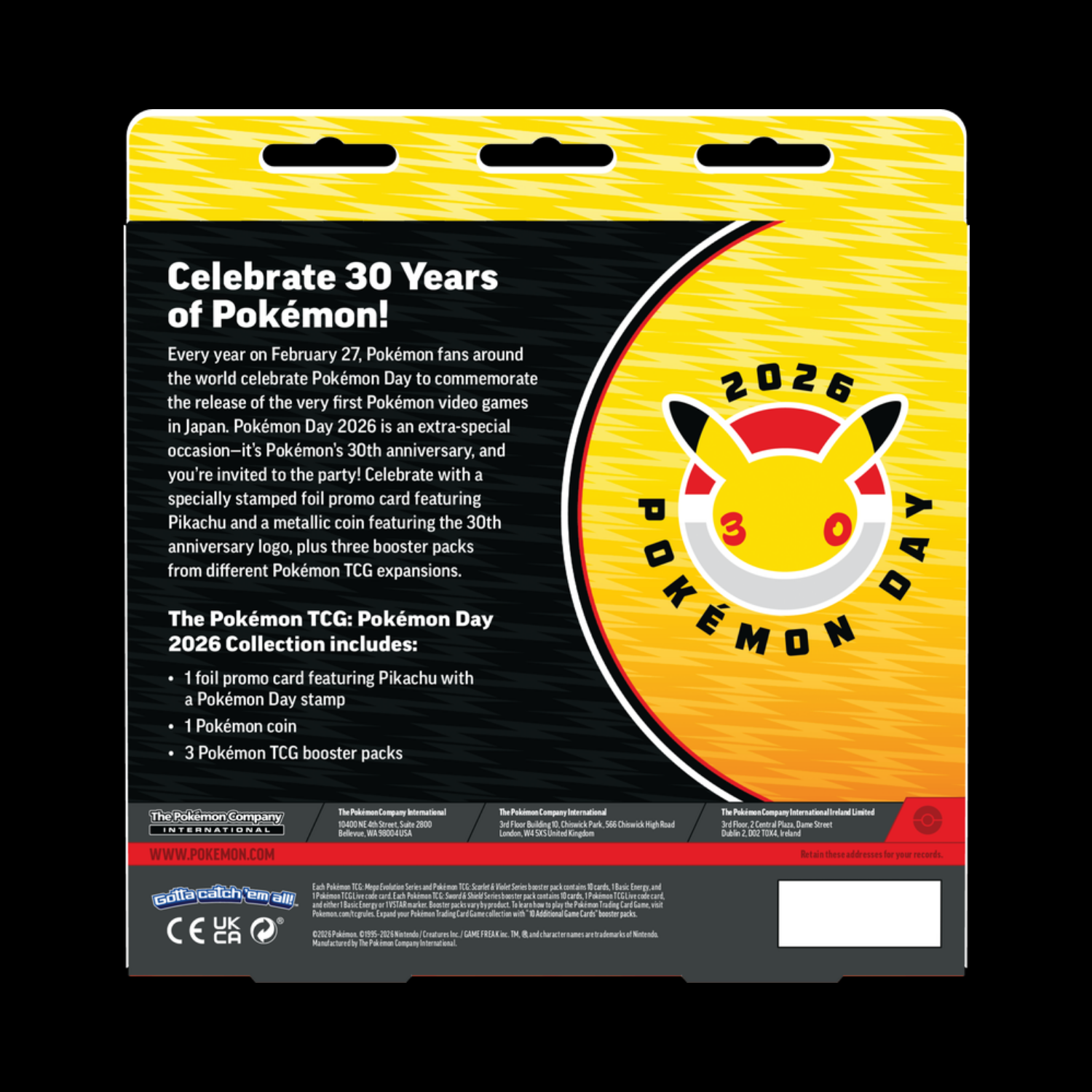 Every year on February 27, Pokémon fans around the world celebrate Pokémon Day to commemorate the release of the very first Pokémon video games in Japan. Pokémon Day 2026 is an extra-special occasion—it’s Pokémon’s 30th anniversary, and you’re invited to the party! Celebrate with a specially stamped foil promo card featuring Pikachu and a metallic coin featuring the 30th anniversary logo, plus three booster packs from different Pokémon TCG expansions.