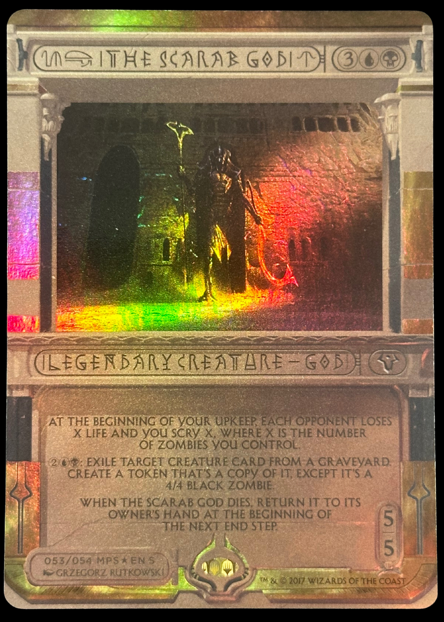 2UB: Exile target creature card from a graveyard. Create a token that's a copy of it, except it's a 4/4 black Zombie. When The Scarab God dies, return it to its owner's hand at the beginning of the next end step. |