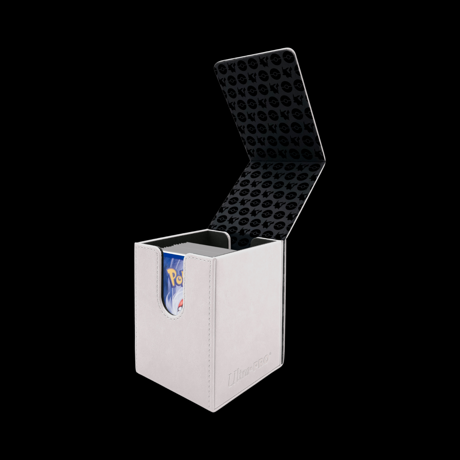 Alcove Flip Boxes for Pokémon feature a debossed image of Arceus in a leatherette finish with foil detailing; a strong magnetic closure; and dual thumb notches for easy access to your deck. This deck box holds up to 100 standard size trading cards double-sleeved in Ultra PRO Deck Protector® sleeves.