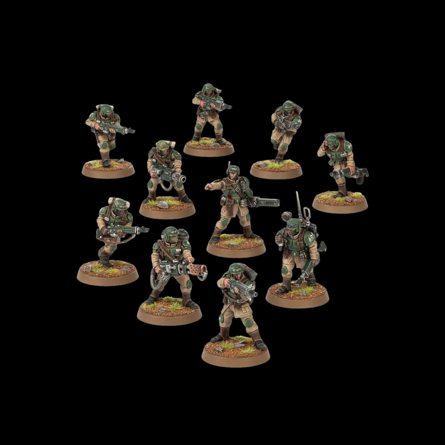 Born soldiers, the Shock Troops of Cadia are trained for military service from the moment they can hold a rifle. Long years of rigorous firing drills have forged them into expert sharpshooters, skilled in both dogged defence and storming assault. Cadian Shock Troops are held by many as the ideal Imperial soldiers – with countless regiments mustered in their image.
