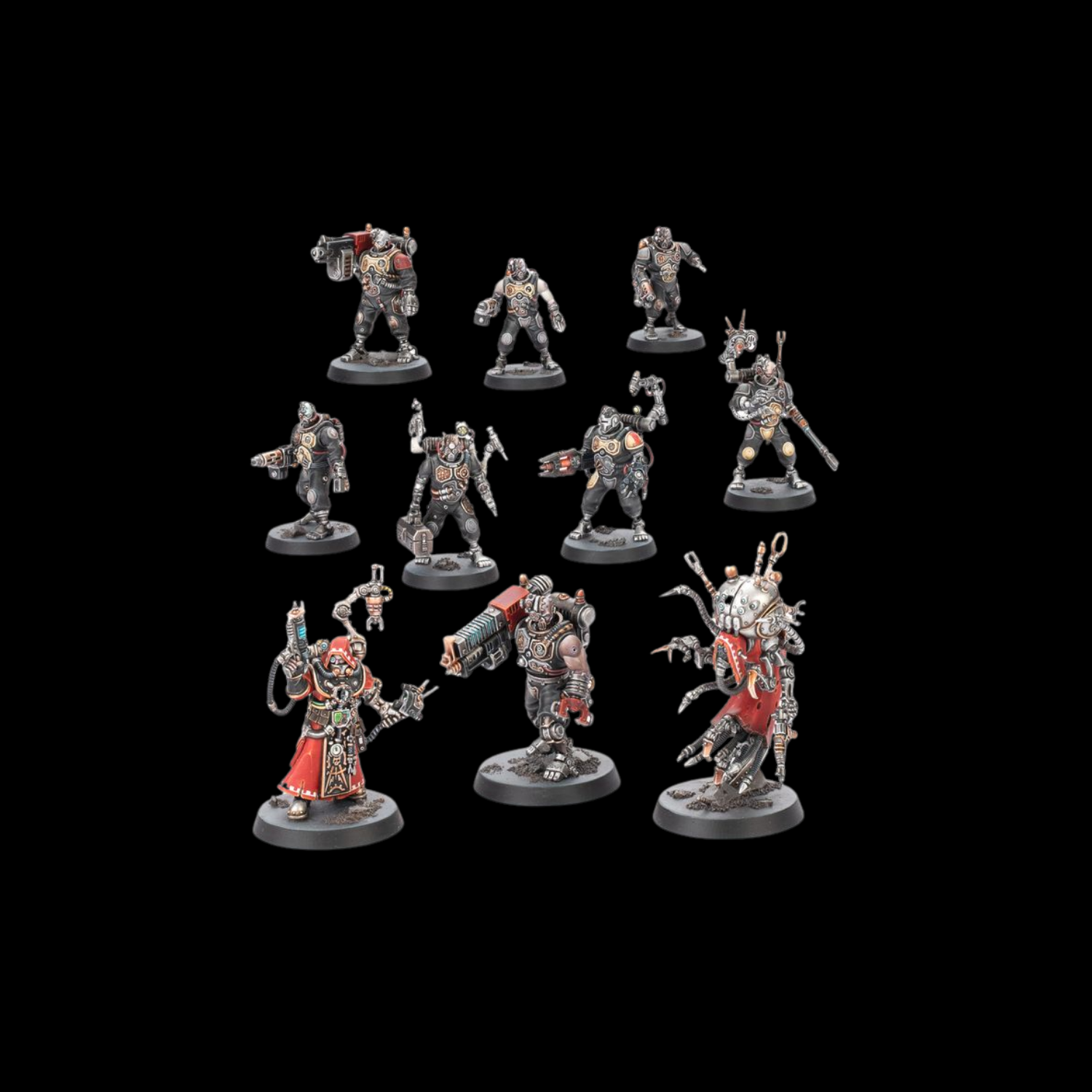 This multipart plastic kit builds 10 Battleclade miniatures which can be used as efficient and specialised operatives in games of Kill Team, or fielded in an Adeptus Mechanicus army in games of Warhammer 40,000. The kit includes interchangeable weapon arms and heads to customise your kill team, plus components to build specialists like a thrall-reprogramming Servitor Underseer, crude Technomedic Servitor, data-relaying Auto-Proxy Servitor, and more.