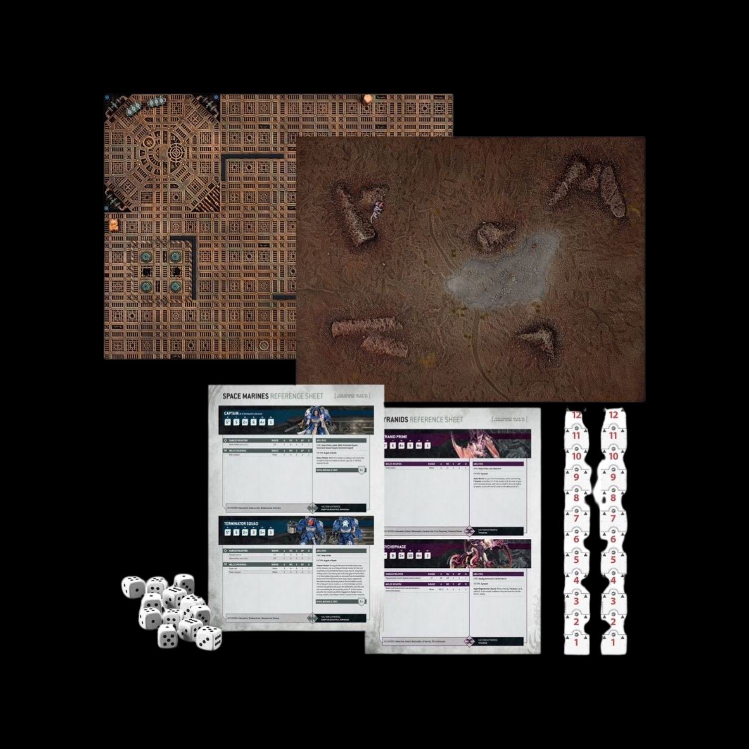 2x range rulers and 10x six-sided dice – These essential accessories are used in games of Warhammer 40,000 for movement, shooting, close combat, and more.