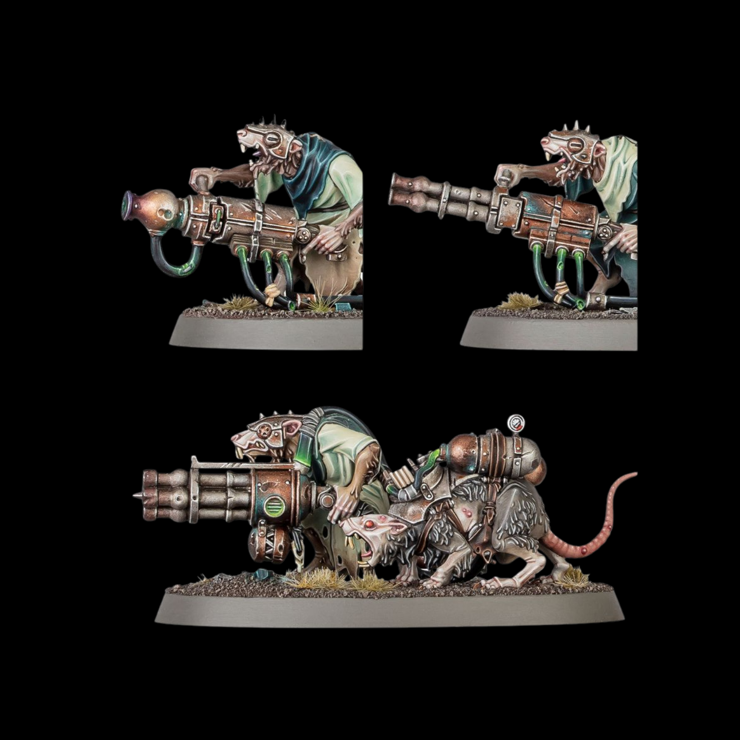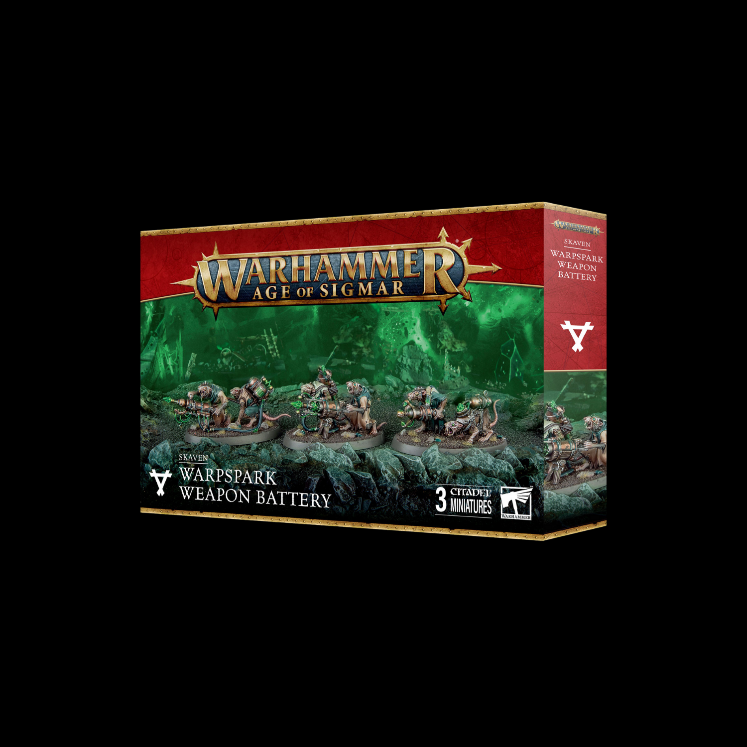 Warpspark Weapon Batteries are members of the Clans Skryre, who often go to war unnoticed among hordes of slavering Clanrats. When the time is right, they reveal themselves, unleashing their bizarre but mighty machines on an unsuspecting foe. Whether through a hail of bullets, gouts of eerie warpflame, or bolts of warp lightning, they reap a deadly harvest for the glory of the Horned Rat.